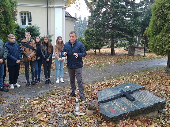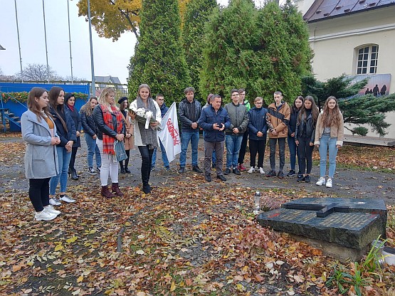 kwiaty i zapaliła znicze przed tablicą pamiątkową znajdującą się przy naszym