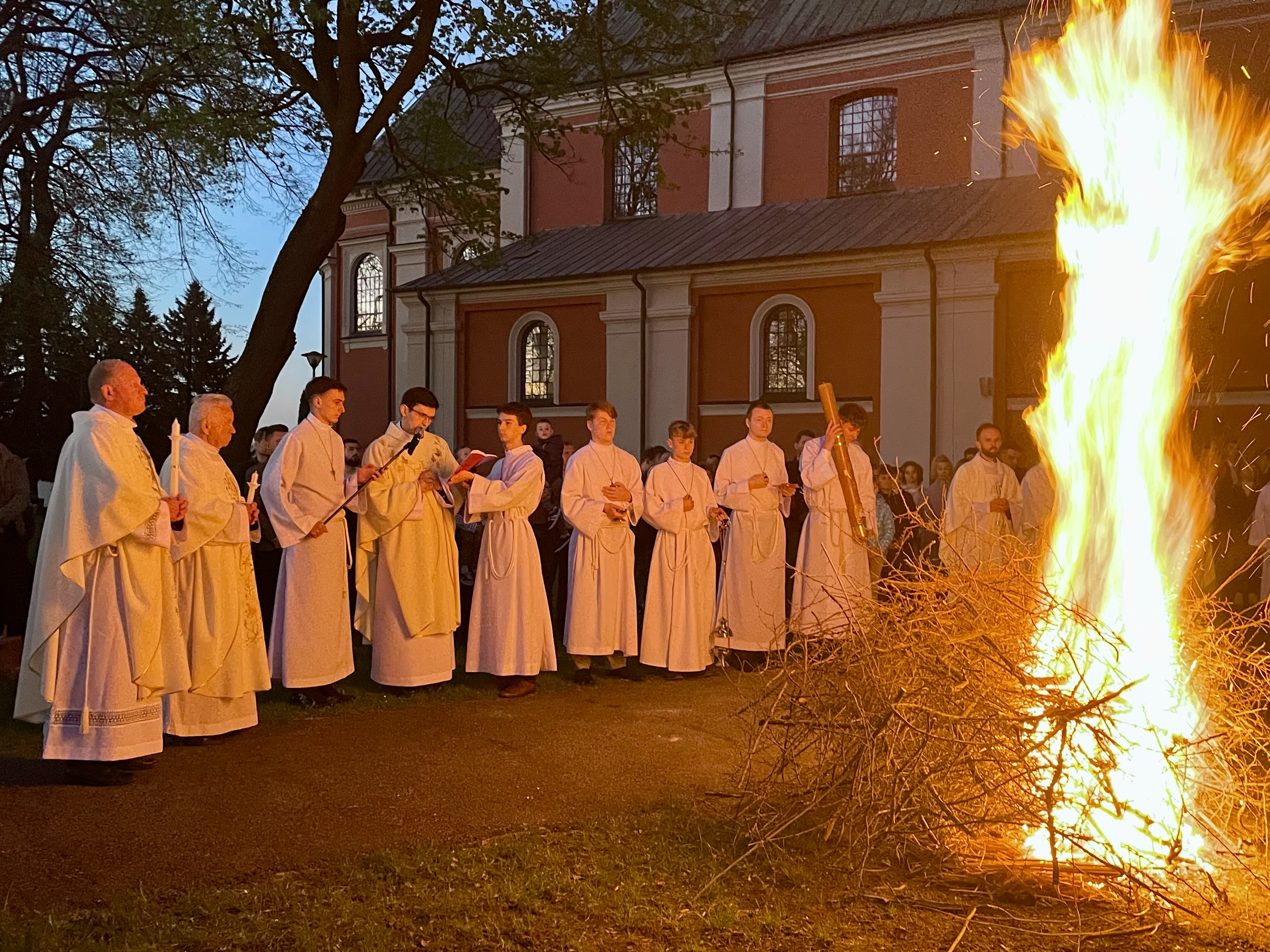 Poświęcenie ognia, wody chrzcielnej i Boże Słowo i Msza św. o tajemnicy zmartwychwstania - to elementy składające się na liturgię Wielkiej Soboty, bogatej w symbole i znaczenia. Liturgii przewodniczył ks. Damian Surowiec, wikariusz parafii wraz ze wszystkimi kapłanami posługującymi w parafii. Wspólną modlitwę chrześcijańskiego czuwania przed zmartwychwstaniem Chrystusa, rozpoczął obrzęd poświęcenia ognia i Paschału. Przy jego świetle i zapalonych przez wiernych świec w świątyni odśpiewano Orędzie Paschalne, wyjaśniające symbolikę światła, którym jest Chrystus powstający z mroku śmierci do życia. Następnie wierni wysłuchali rozbudowanej do kilku czytań Liturgii Słowa. Homilię wygłosił ks. Tomasz Kopeć wskazując na znaczenie liturgii prowadzącej do zrozumienia tajemnicy zmartwychwstania Chrystusa.
