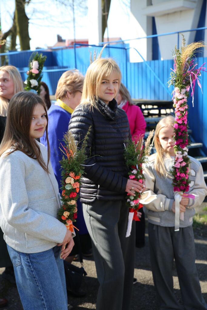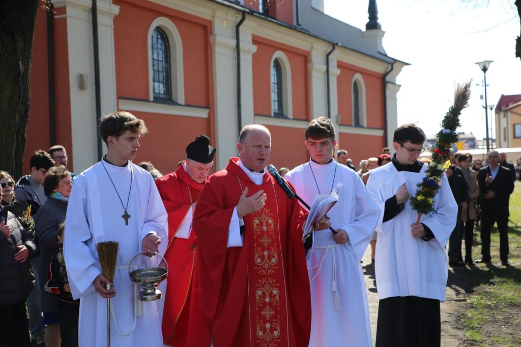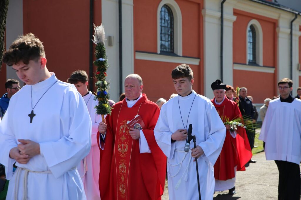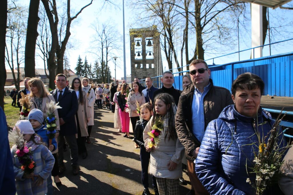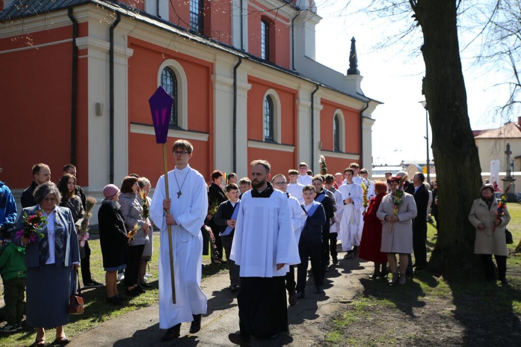 Podczas Mszy św. o godz. 10.30 odbyła się uroczysta procesja z palmami. Na wspólnej modlitwie zgromadzili się liczni parafianie i mieszkańcy miasta. Mszy św. przewodniczył ks. Tomasz Lis, proboszcz, który podziękował za udział we Mszy św. i procesji oraz uczestnikom konkursu za wykonane palmy. W procesji wzięli udział osoby, które wzięły udział w konkursie prezentując własnoręcznie wykonane palmy. Pośród uczestników wspólnej modlitwy nie zabrakło całych rodzin z dziećmi, które dumnie prezentowały palmy. Jak podkreślali parafialnie w wielu domach palmy nadal wykonuje się własnoręcznie, a poświęcone gałązki umieszcza się w ważnych miejscach domu, gdyż jak przekazują rodzice poświęcona palma ma chronić przed złem i przypominać o tym by życiem wychwalać Boga za dzieło odkupienia.