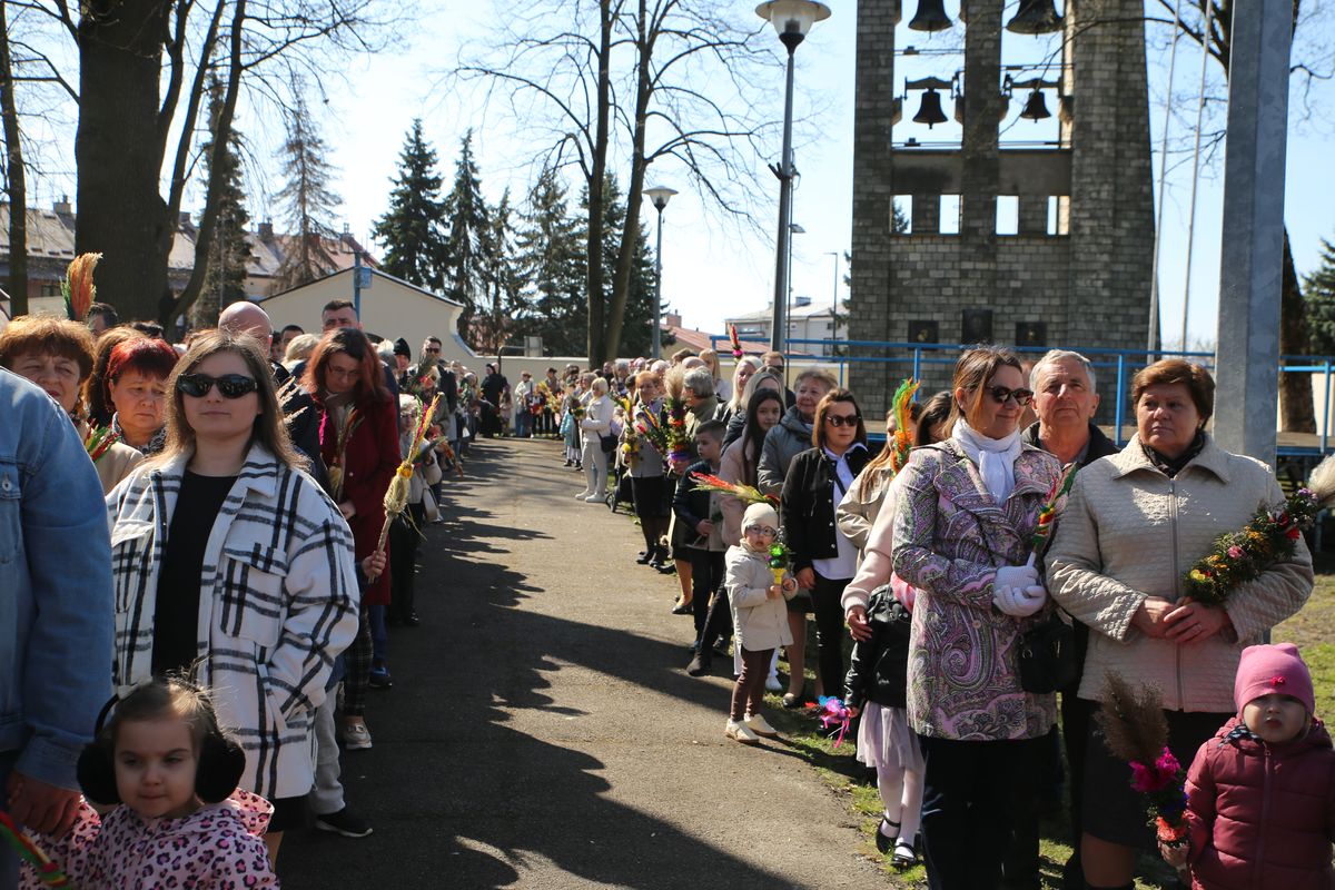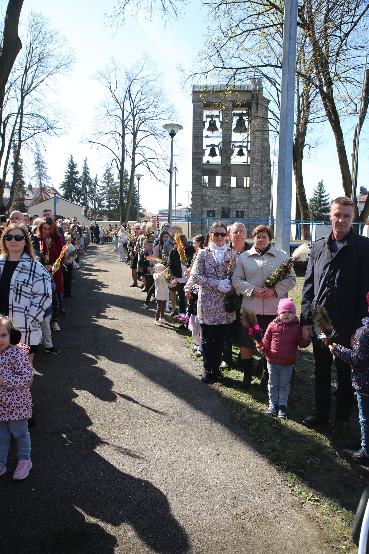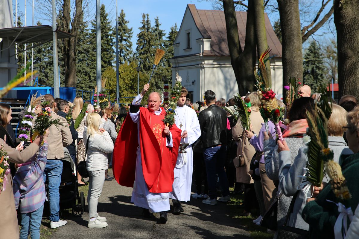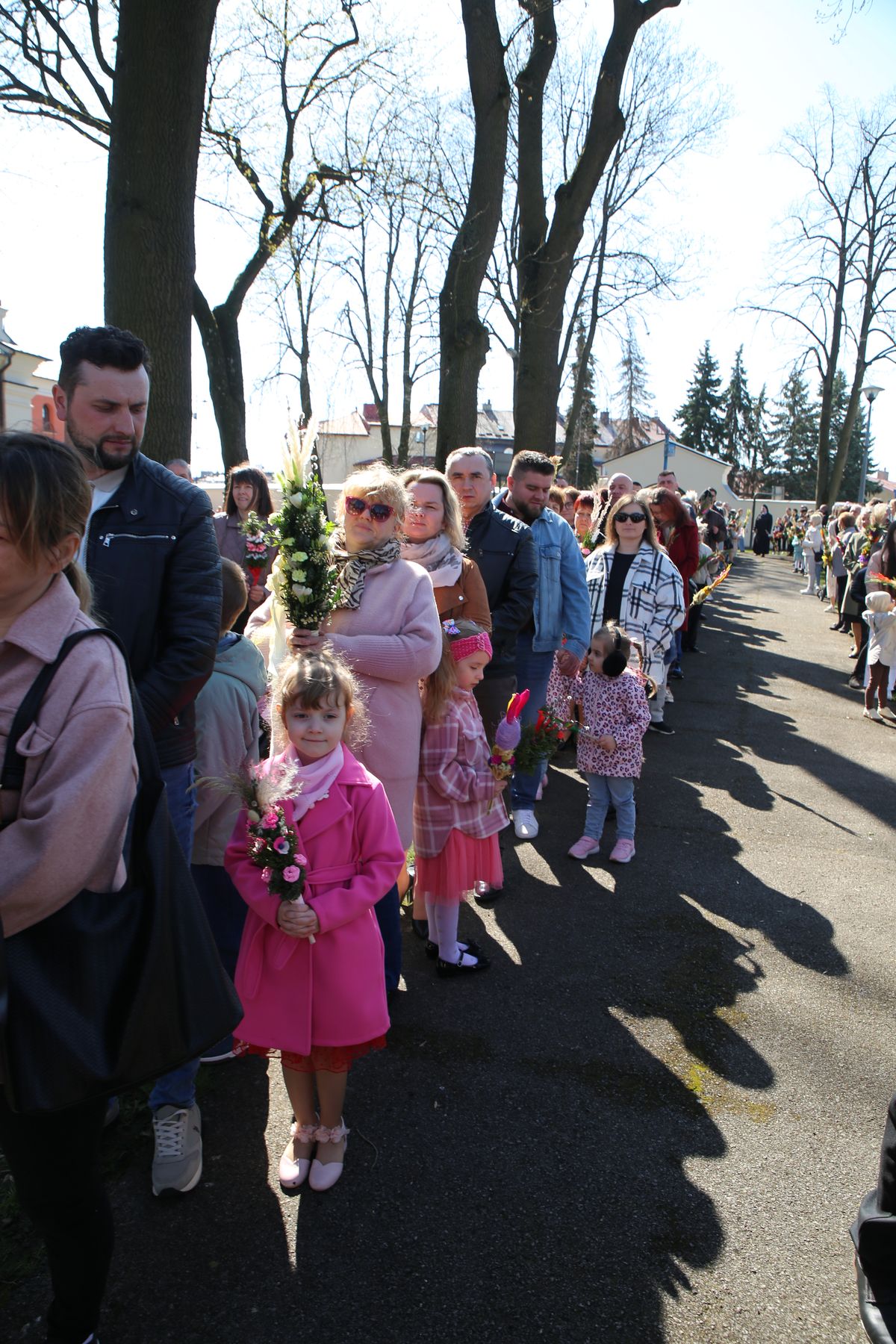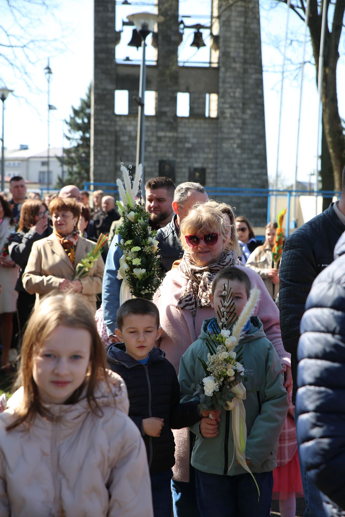 Podczas Mszy św. o godz. 10.30 odbyła się uroczysta procesja z palmami. Na wspólnej modlitwie zgromadzili się liczni parafianie i mieszkańcy miasta. Mszy św. przewodniczył ks. Tomasz Lis, proboszcz, który podziękował za udział we Mszy św. i procesji oraz uczestnikom konkursu za wykonane palmy. W procesji wzięli udział osoby, które wzięły udział w konkursie prezentując własnoręcznie wykonane palmy. Pośród uczestników wspólnej modlitwy nie zabrakło całych rodzin z dziećmi, które dumnie prezentowały palmy. Jak podkreślali parafialnie w wielu domach palmy nadal wykonuje się własnoręcznie, a poświęcone gałązki umieszcza się w ważnych miejscach domu, gdyż jak przekazują rodzice poświęcona palma ma chronić przed złem i przypominać o tym by życiem wychwalać Boga za dzieło odkupienia.