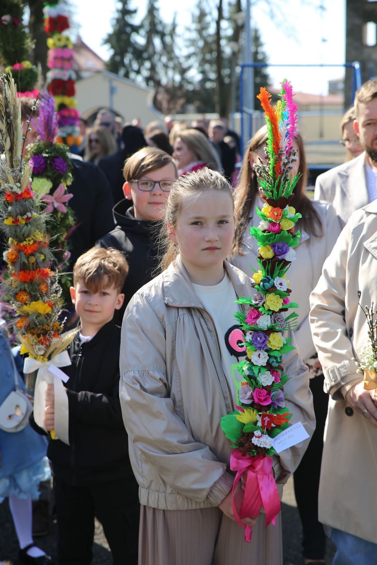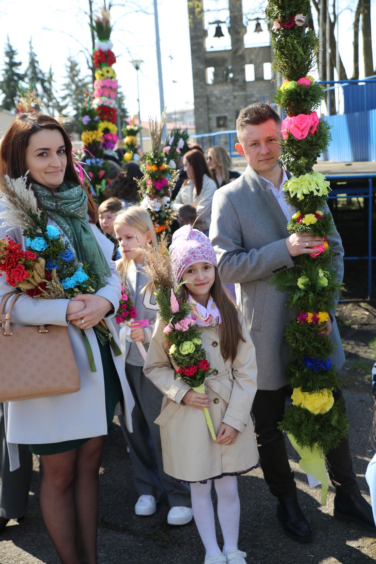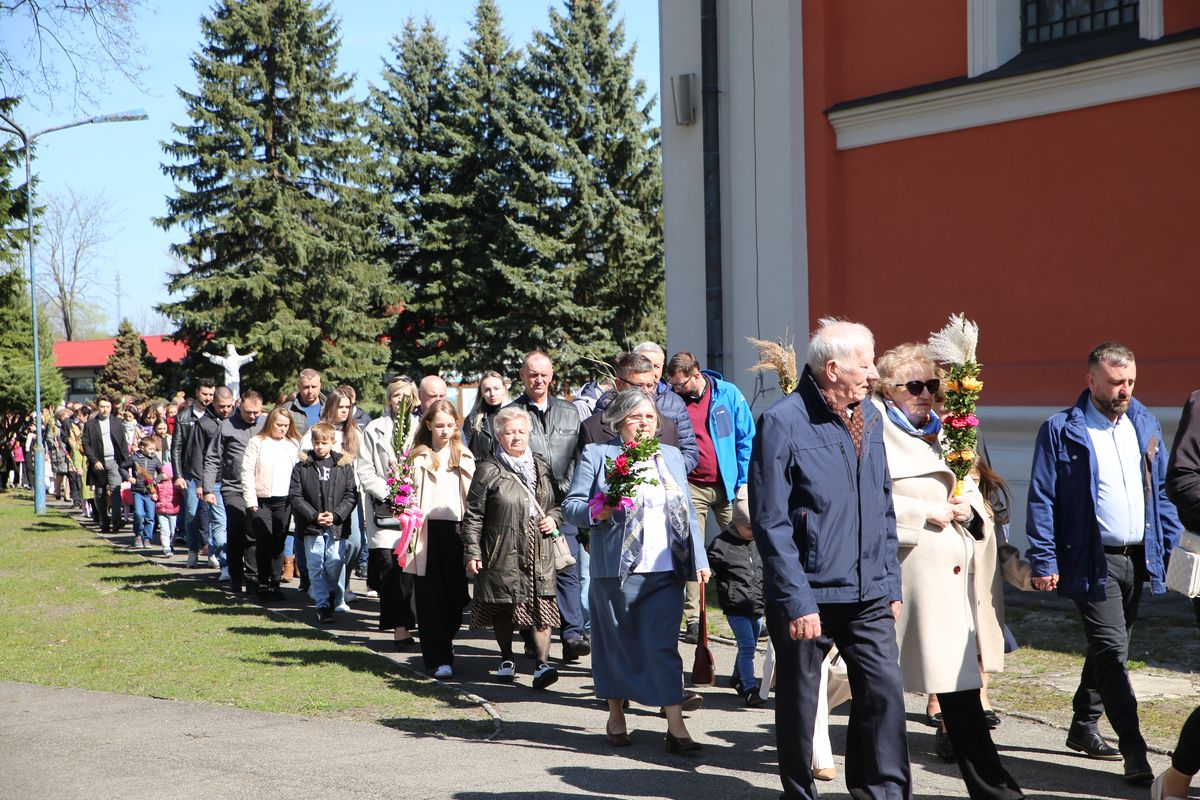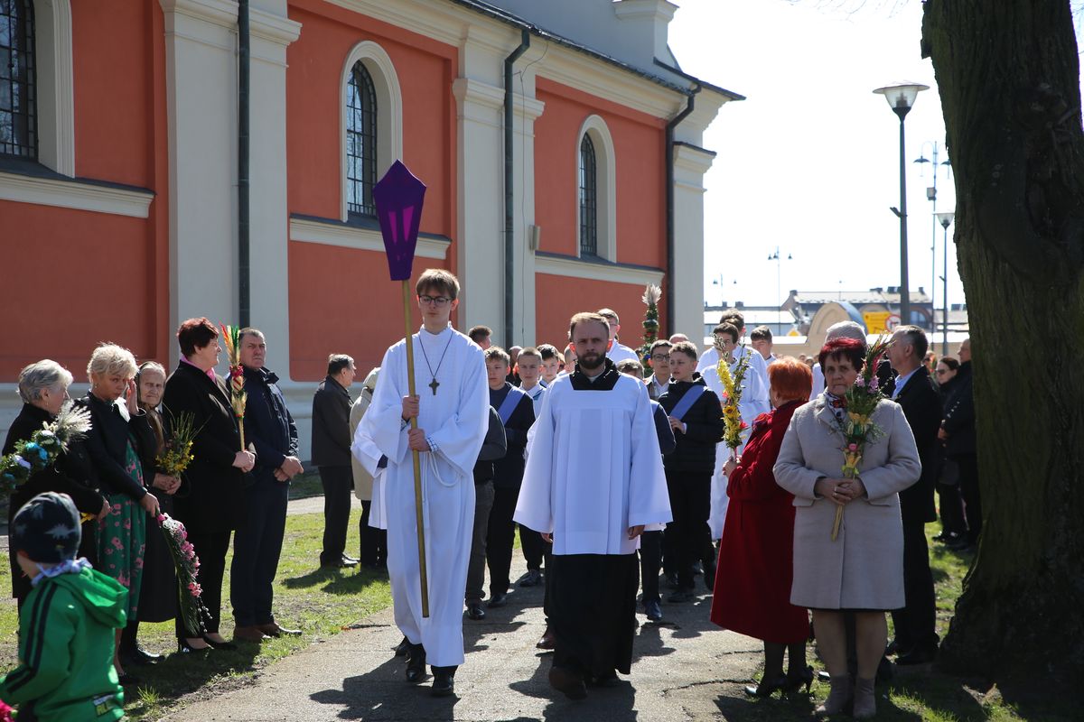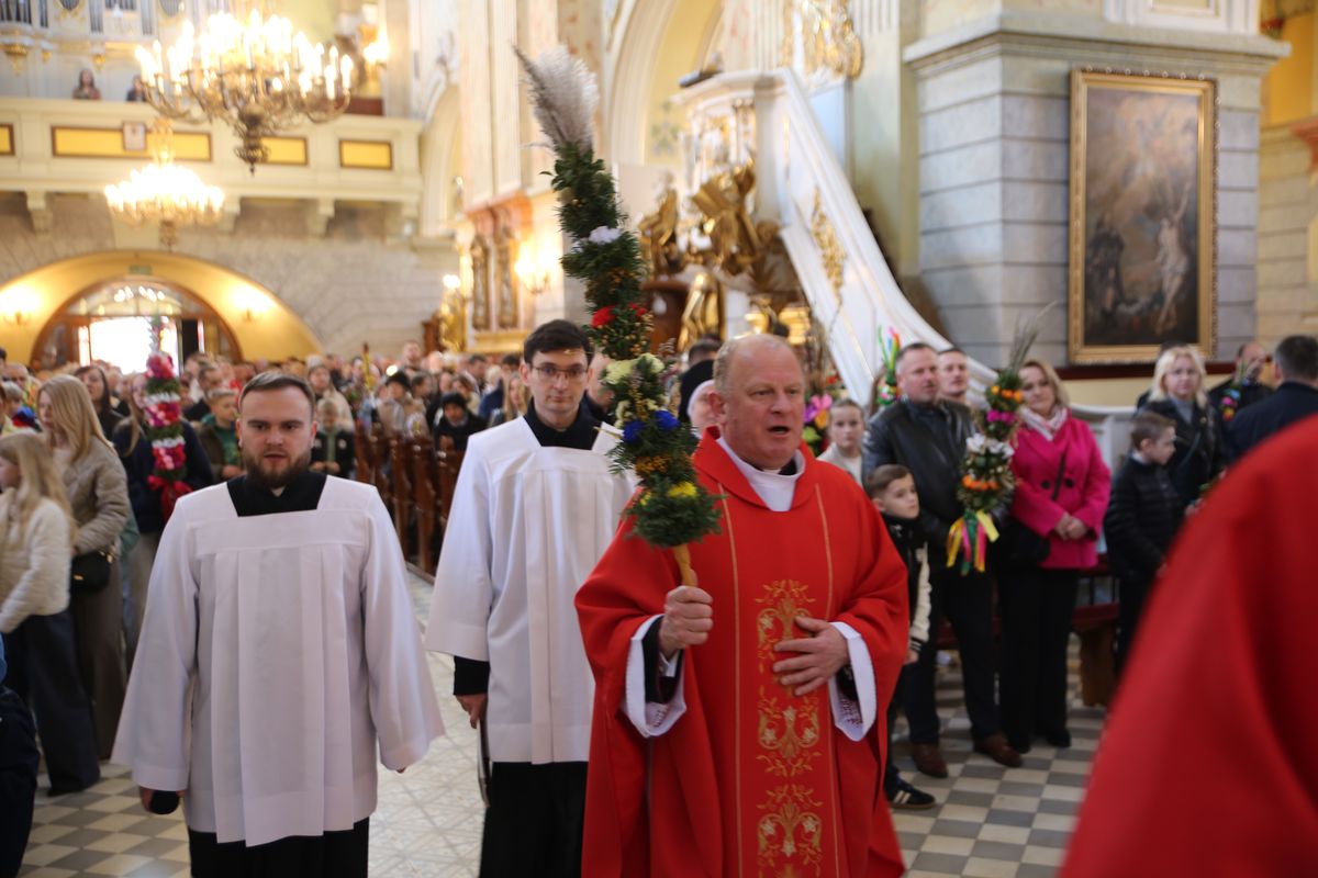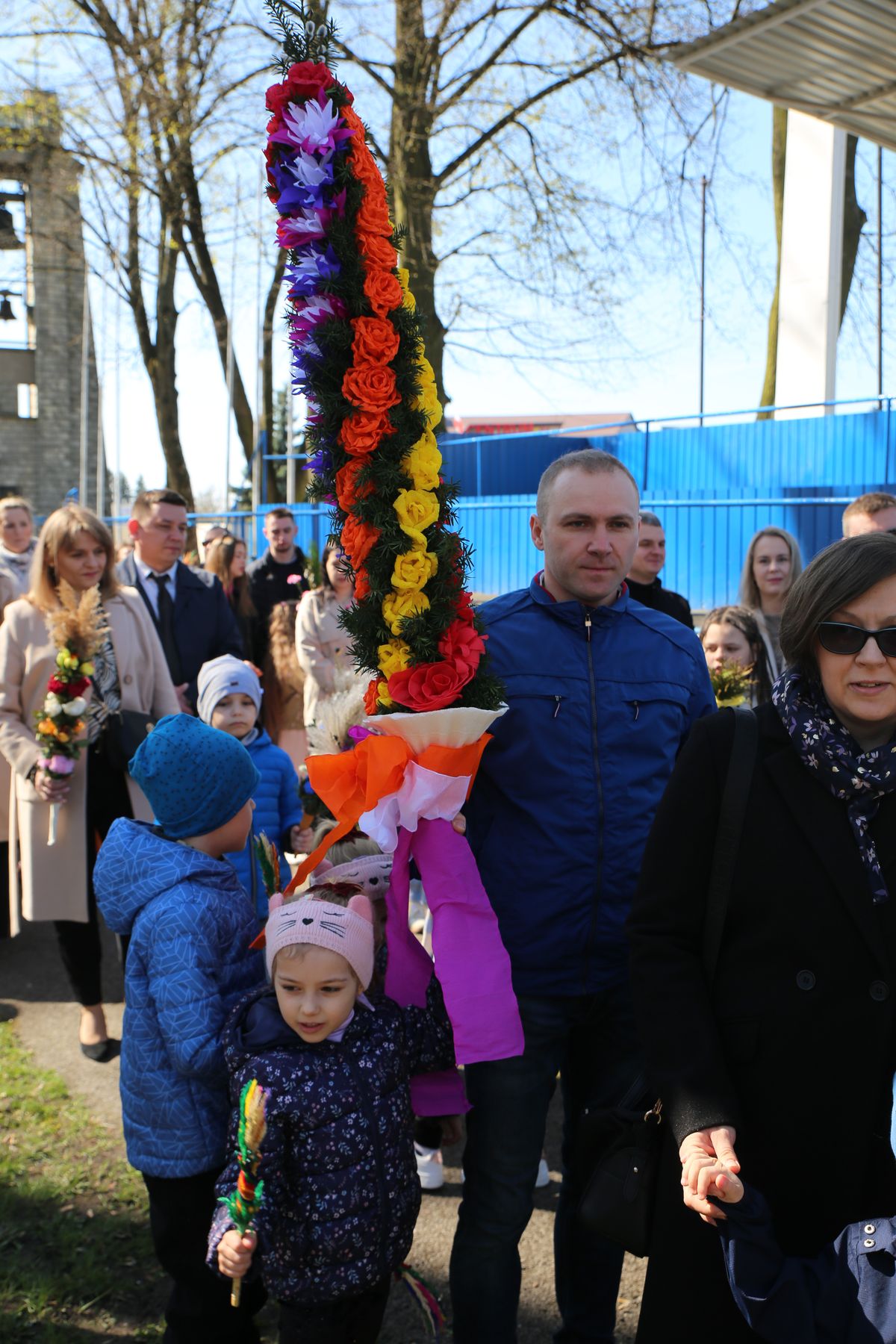 Podczas Mszy św. o godz. 10.30 odbyła się uroczysta procesja z palmami. Na wspólnej modlitwie zgromadzili się liczni parafianie i mieszkańcy miasta. Mszy św. przewodniczył ks. Tomasz Lis, proboszcz, który podziękował za udział we Mszy św. i procesji oraz uczestnikom konkursu za wykonane palmy. W procesji wzięli udział osoby, które wzięły udział w konkursie prezentując własnoręcznie wykonane palmy. Pośród uczestników wspólnej modlitwy nie zabrakło całych rodzin z dziećmi, które dumnie prezentowały palmy. Jak podkreślali parafialnie w wielu domach palmy nadal wykonuje się własnoręcznie, a poświęcone gałązki umieszcza się w ważnych miejscach domu, gdyż jak przekazują rodzice poświęcona palma ma chronić przed złem i przypominać o tym by życiem wychwalać Boga za dzieło odkupienia.
