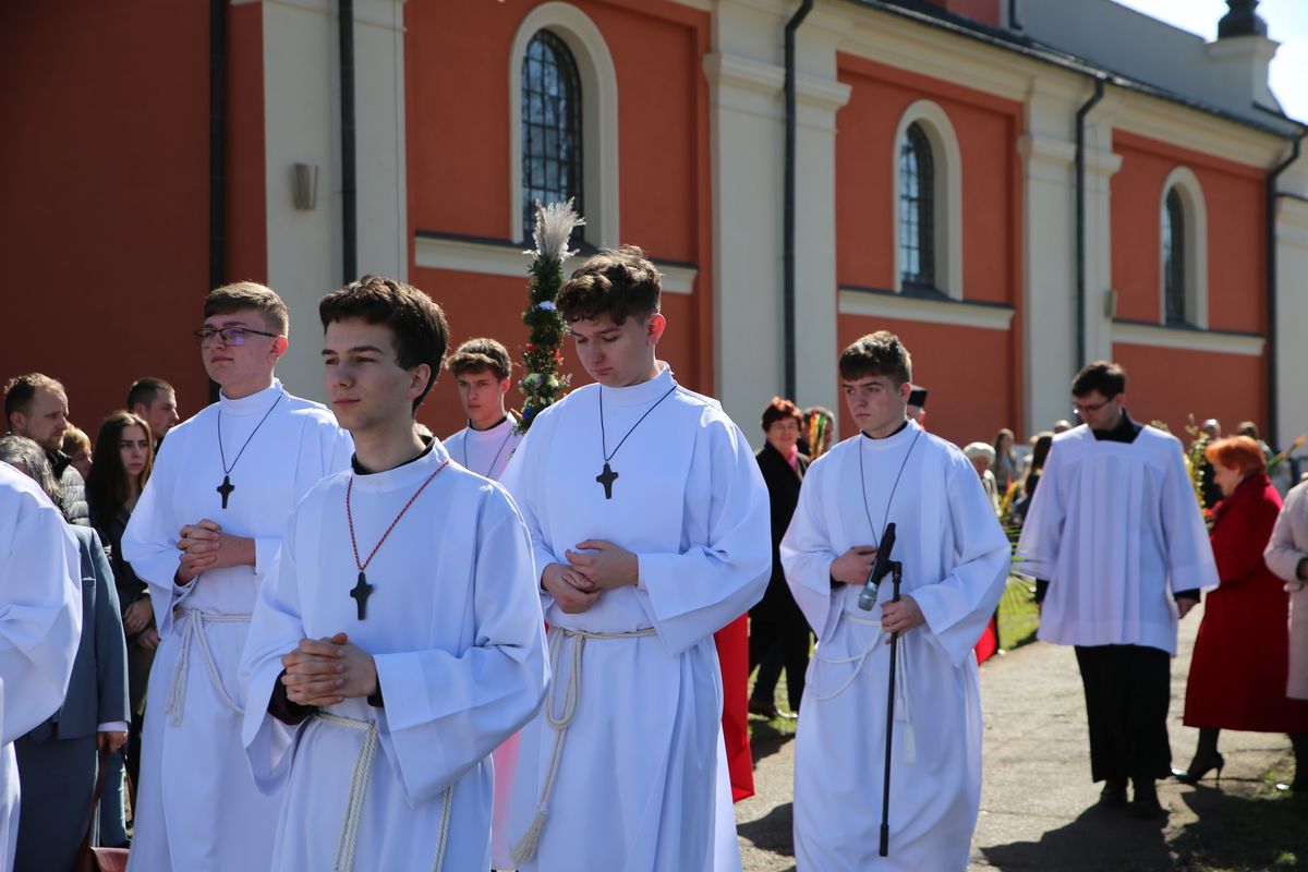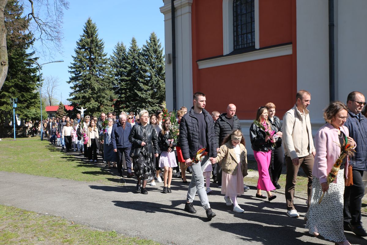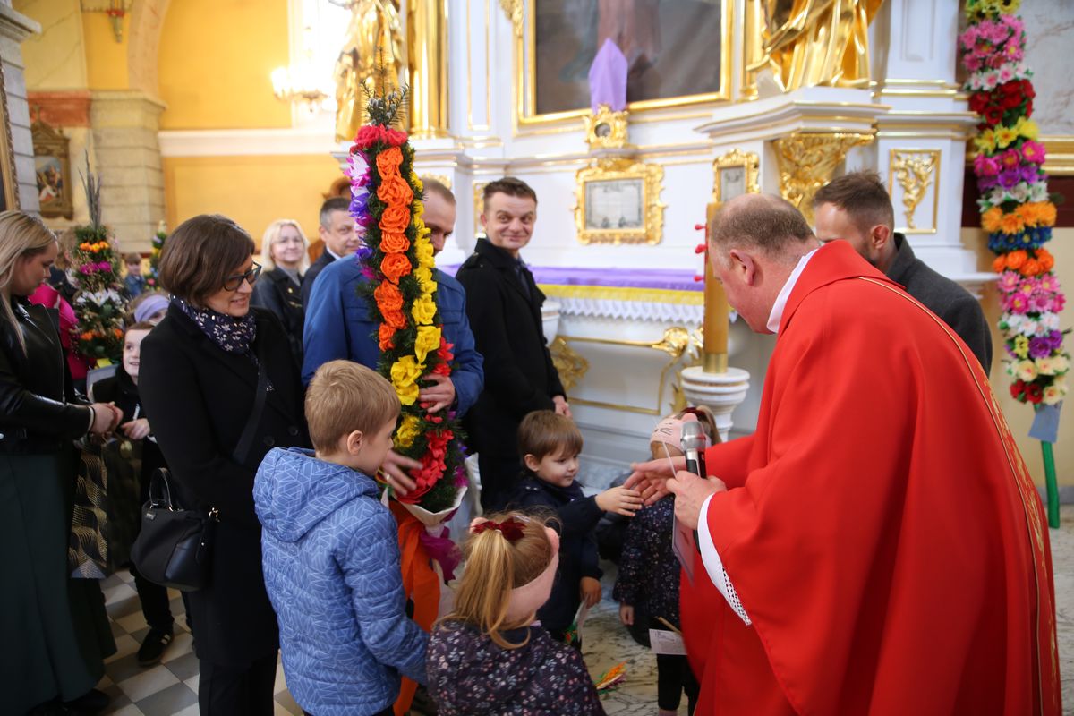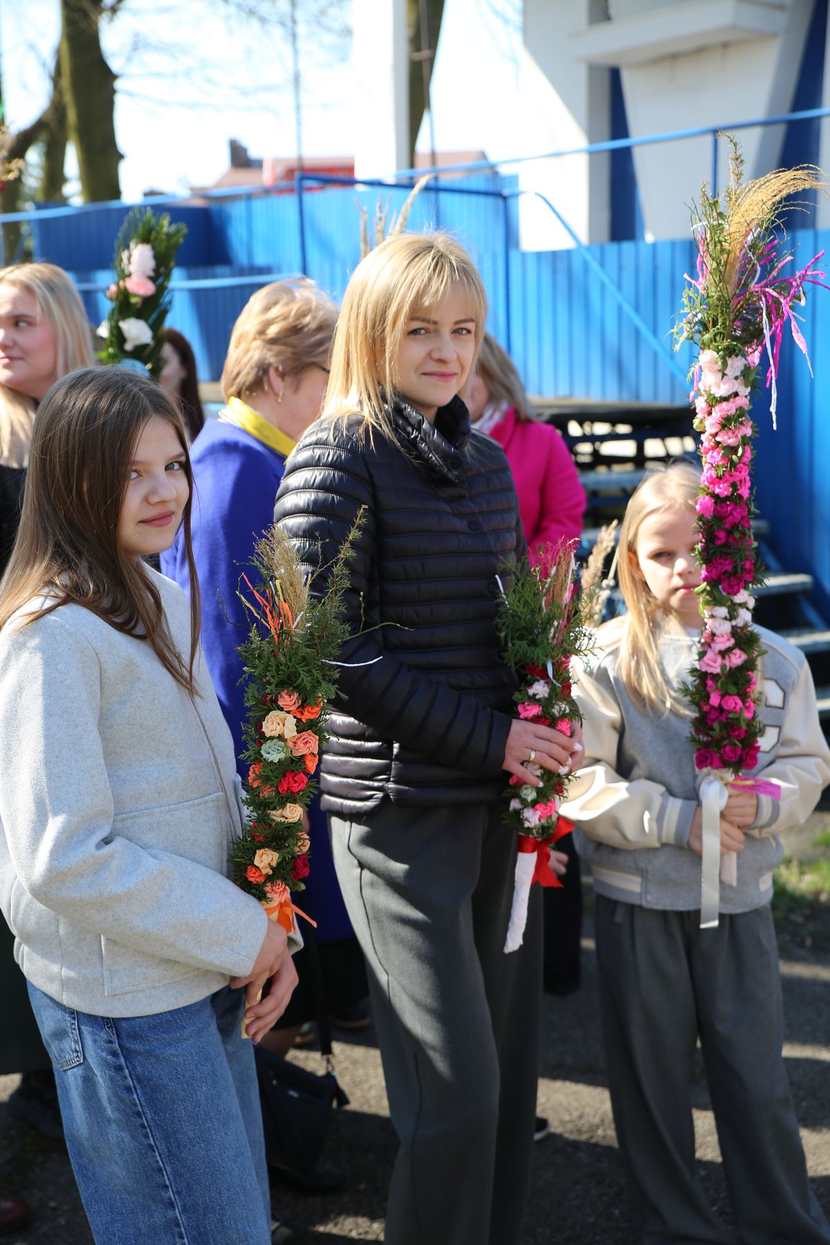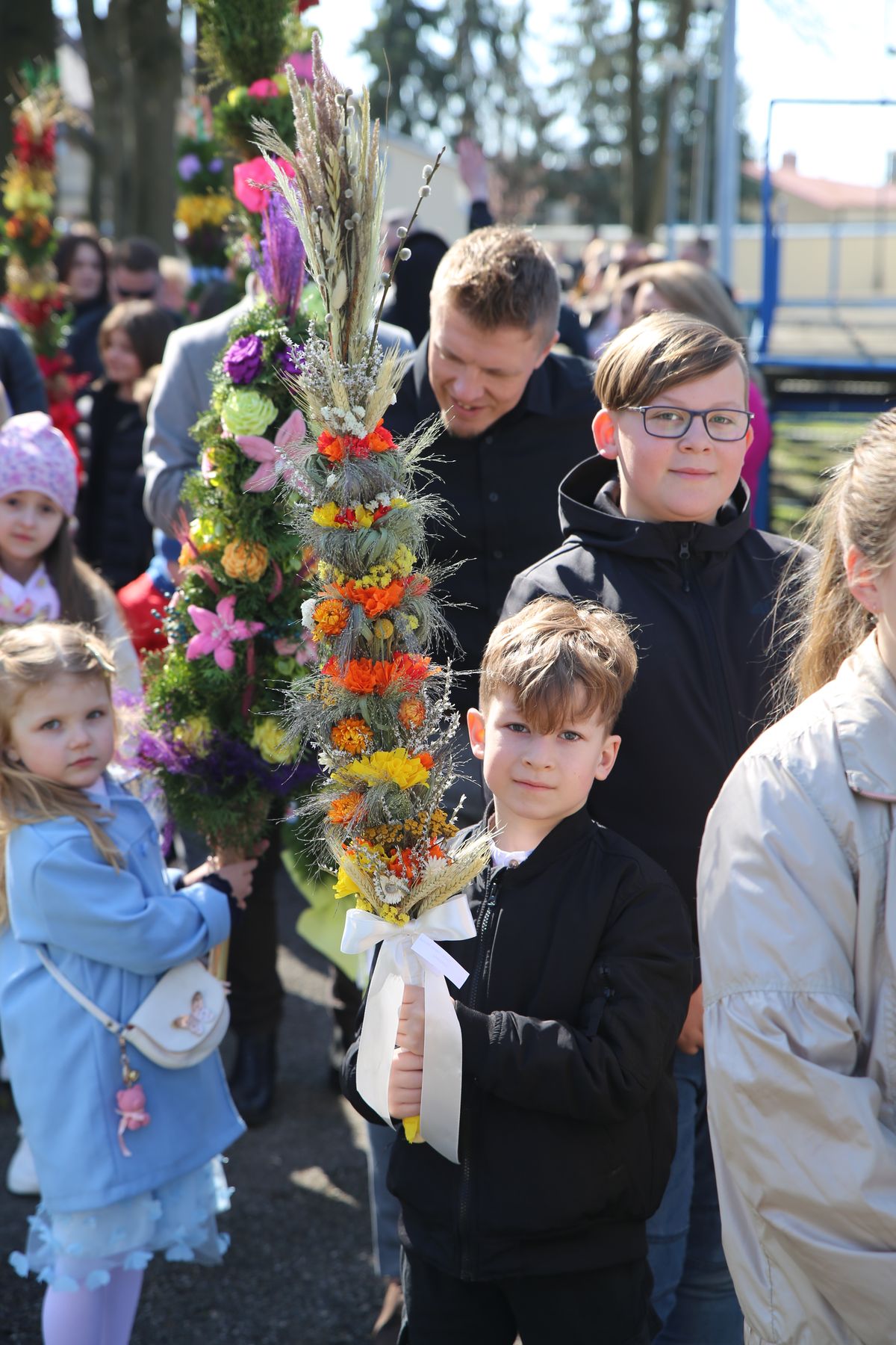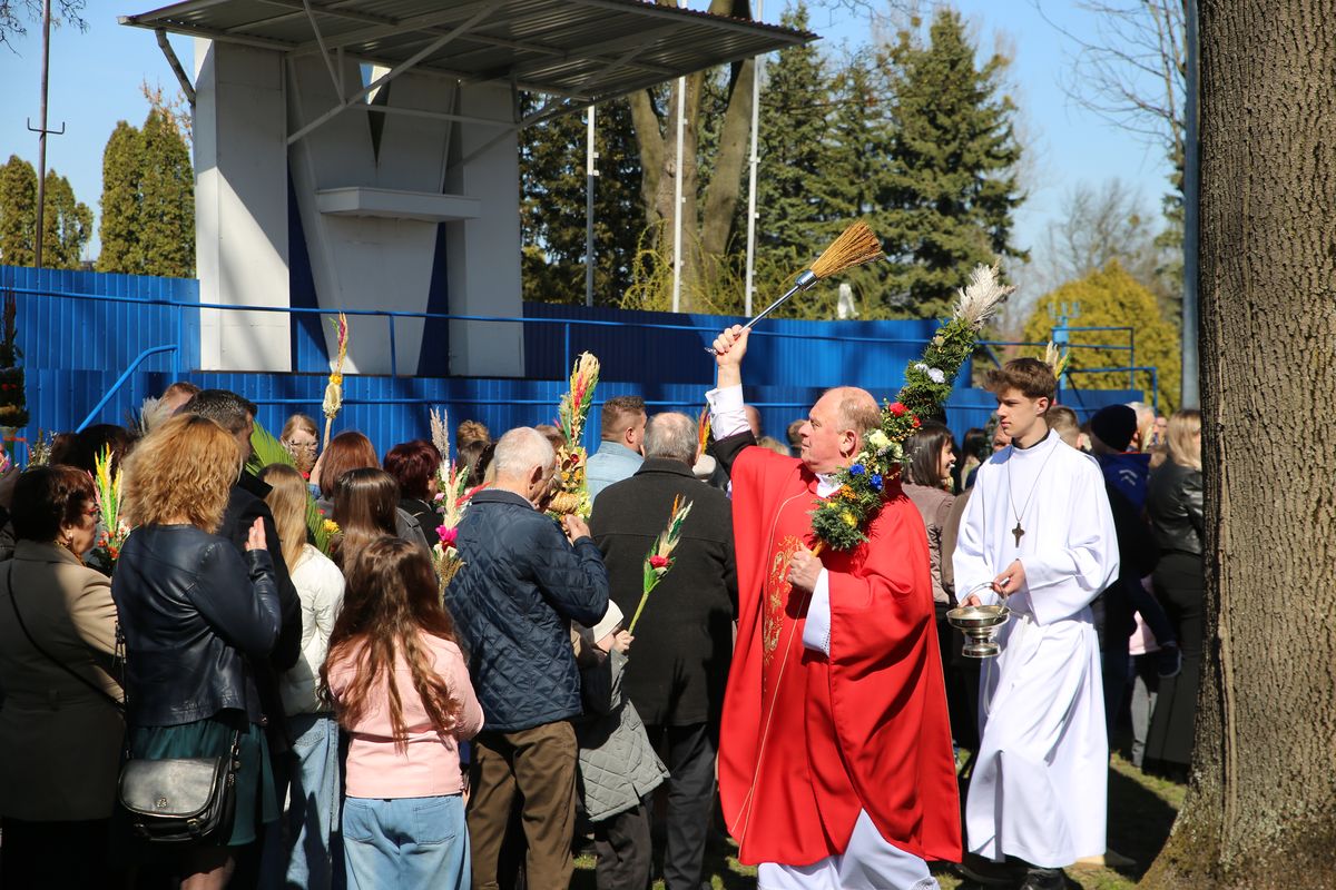 Podczas Mszy św. o godz. 10.30 odbyła się uroczysta procesja z palmami. Na wspólnej modlitwie zgromadzili się liczni parafianie i mieszkańcy miasta. Mszy św. przewodniczył ks. Tomasz Lis, proboszcz, który podziękował za udział we Mszy św. i procesji oraz uczestnikom konkursu za wykonane palmy. W procesji wzięli udział osoby, które wzięły udział w konkursie prezentując własnoręcznie wykonane palmy. Pośród uczestników wspólnej modlitwy nie zabrakło całych rodzin z dziećmi, które dumnie prezentowały palmy. Jak podkreślali parafialnie w wielu domach palmy nadal wykonuje się własnoręcznie, a poświęcone gałązki umieszcza się w ważnych miejscach domu, gdyż jak przekazują rodzice poświęcona palma ma chronić przed złem i przypominać o tym by życiem wychwalać Boga za dzieło odkupienia.
