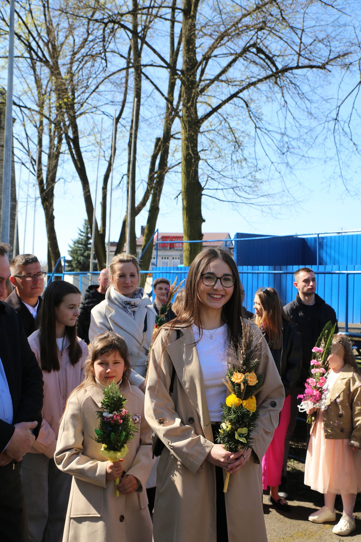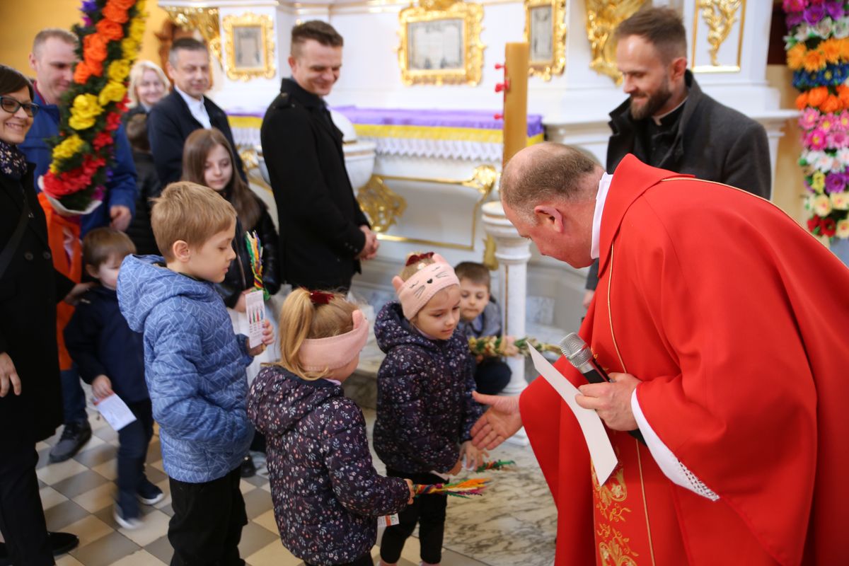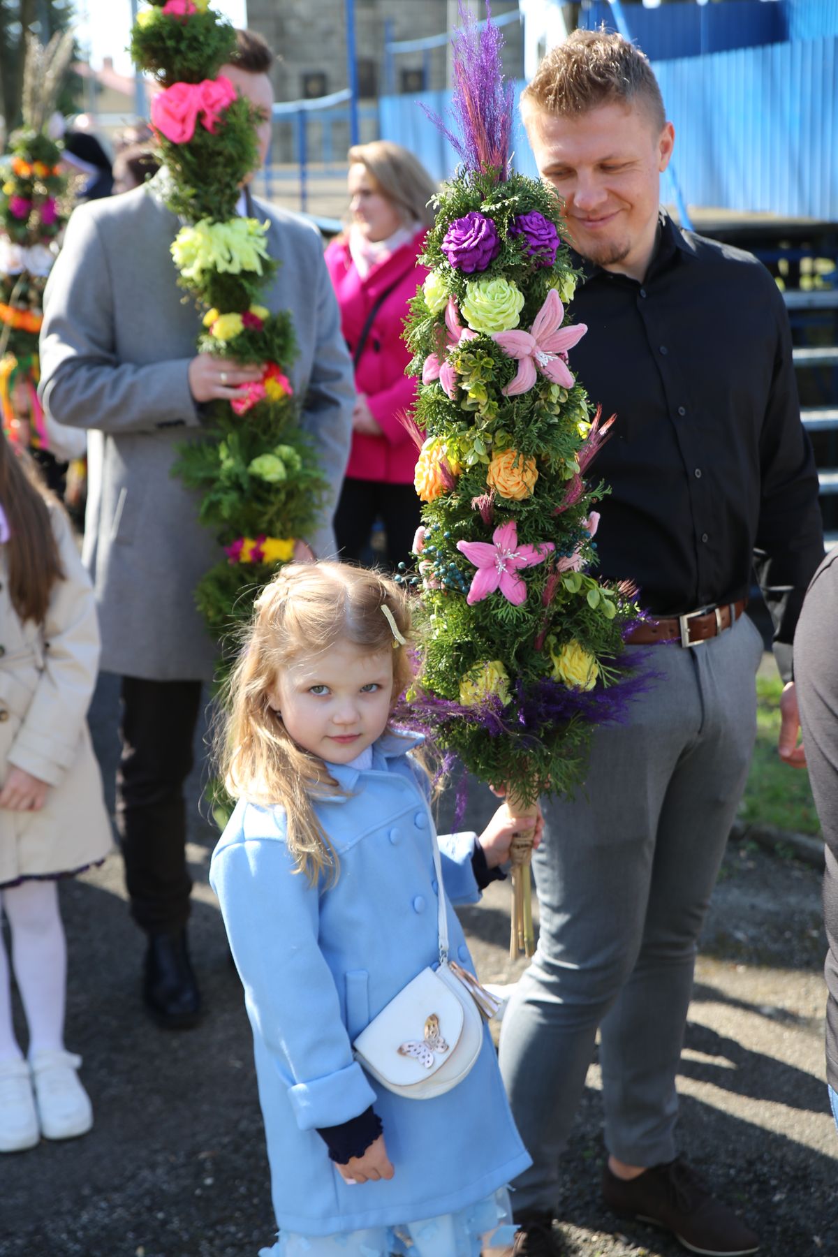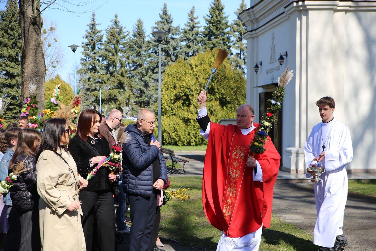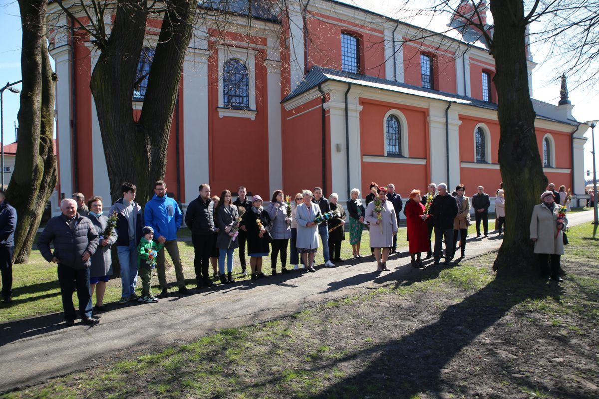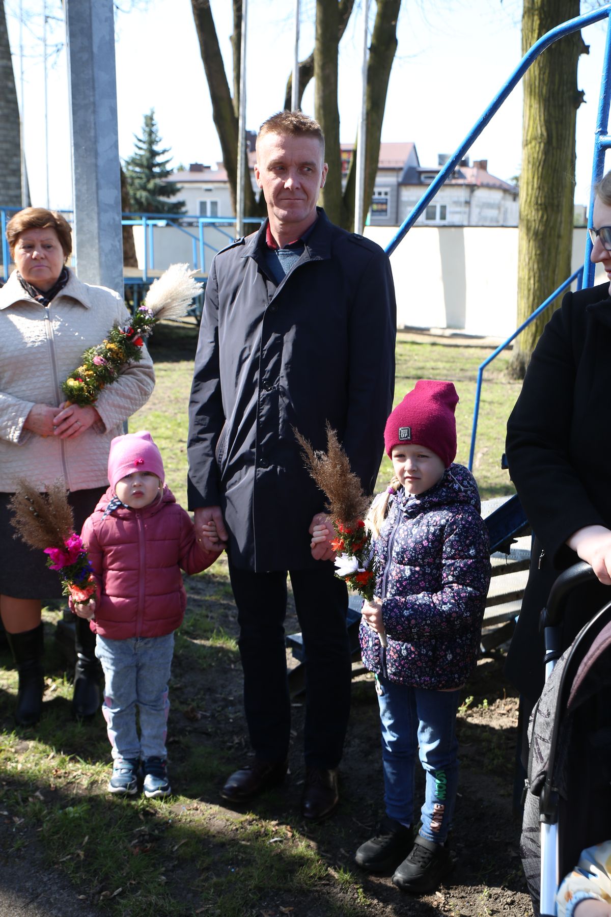 Podczas Mszy św. o godz. 10.30 odbyła się uroczysta procesja z palmami. Na wspólnej modlitwie zgromadzili się liczni parafianie i mieszkańcy miasta. Mszy św. przewodniczył ks. Tomasz Lis, proboszcz, który podziękował za udział we Mszy św. i procesji oraz uczestnikom konkursu za wykonane palmy. W procesji wzięli udział osoby, które wzięły udział w konkursie prezentując własnoręcznie wykonane palmy. Pośród uczestników wspólnej modlitwy nie zabrakło całych rodzin z dziećmi, które dumnie prezentowały palmy. Jak podkreślali parafialnie w wielu domach palmy nadal wykonuje się własnoręcznie, a poświęcone gałązki umieszcza się w ważnych miejscach domu, gdyż jak przekazują rodzice poświęcona palma ma chronić przed złem i przypominać o tym by życiem wychwalać Boga za dzieło odkupienia.