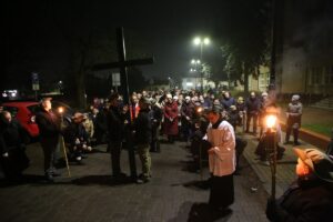 Stacje drogi krzyżowej usytuowane były wzdłuż ulic miasta i prowadziły z kościoła św. Jana Chrzciciela do kościoła św. Jadwigi królowej. Rozważania przygotowali i poprowadzili druhowie i druhny 2 Wielopoziomowej Drużyny Harcerskiej Warta pod opieką ks. Tomasza Kopcia.