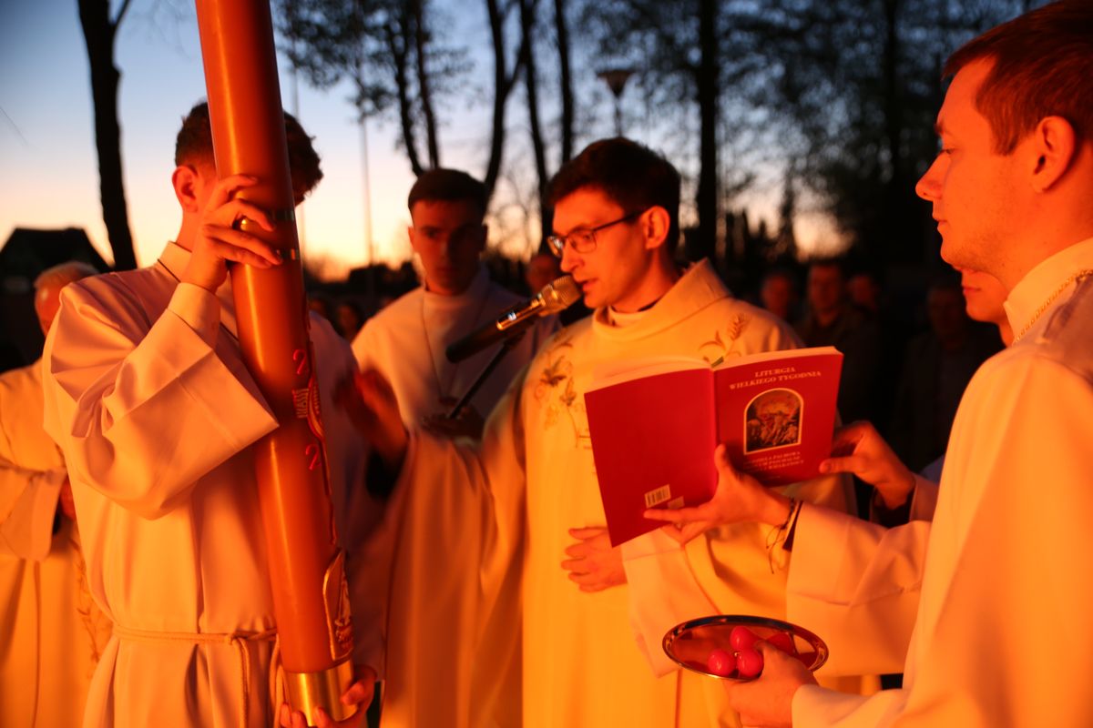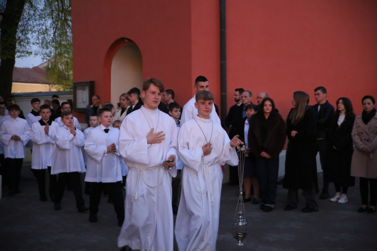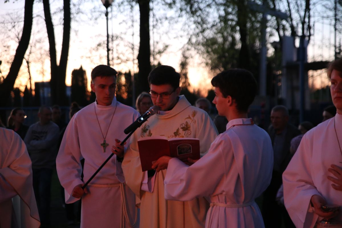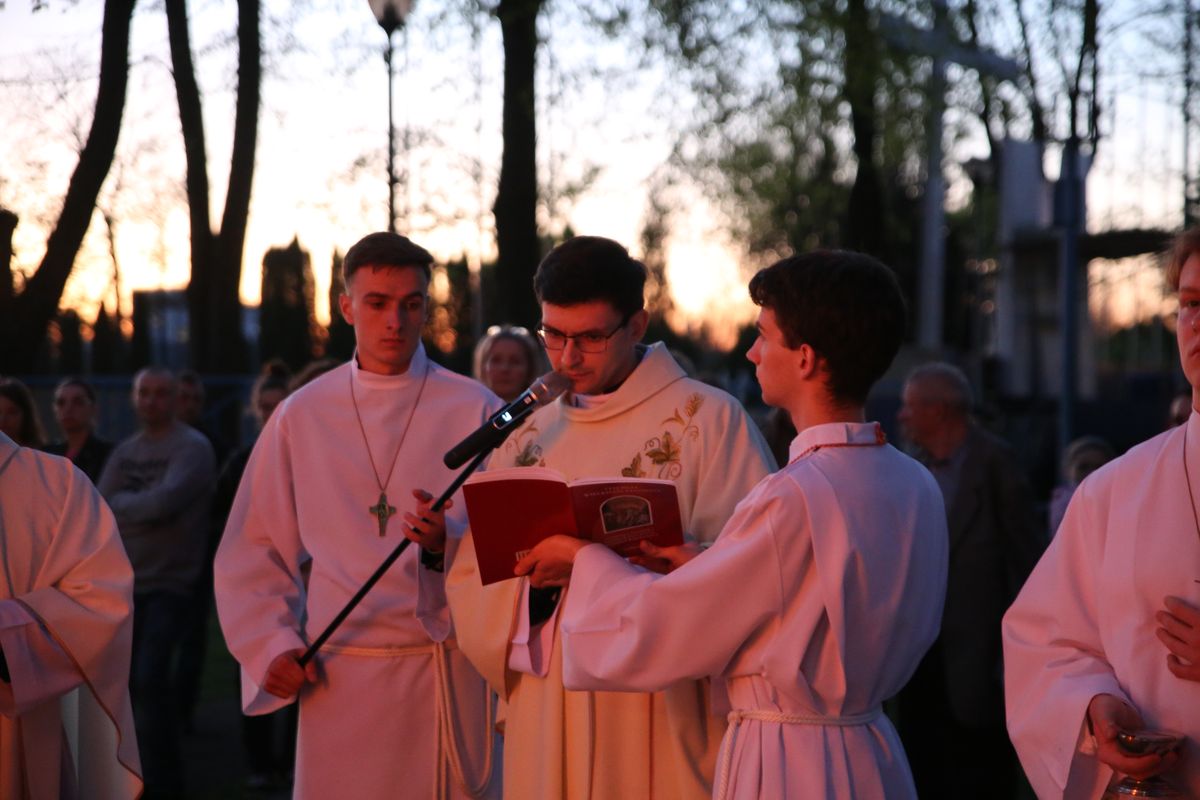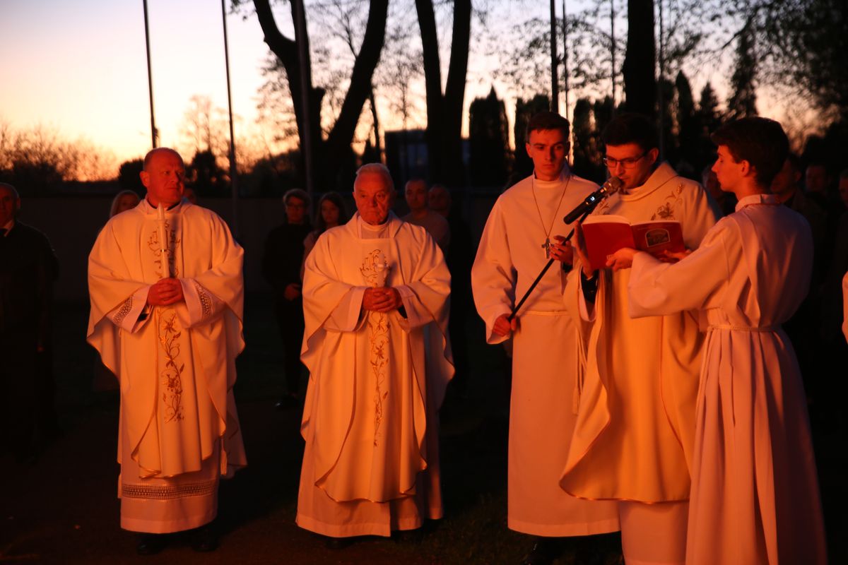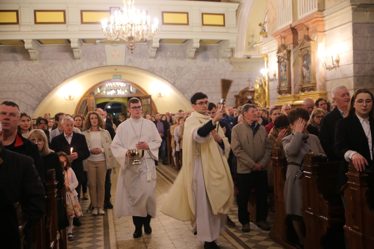 Poświęcenie ognia, wody chrzcielnej i Boże Słowo i Msza św. o tajemnicy zmartwychwstania – to elementy składające się na liturgię Wielkiej Soboty, bogatej w symbole i znaczenia. Liturgii przewodniczył ks. Damian Surowiec, wikariusz parafii wraz ze wszystkimi kapłanami posługującymi w parafii. Wspólną modlitwę chrześcijańskiego czuwania przed zmartwychwstaniem Chrystusa, rozpoczął obrzęd poświęcenia ognia i Paschału. Przy jego świetle i zapalonych przez wiernych świec w świątyni odśpiewano Orędzie Paschalne, wyjaśniające symbolikę światła, którym jest Chrystus powstający z mroku śmierci do życia. Następnie wierni wysłuchali rozbudowanej do kilku czytań Liturgii Słowa. Homilię wygłosił ks. Tomasz Kopeć wskazując na znaczenie liturgii prowadzącej do zrozumienia tajemnicy zmartwychwstania Chrystusa.