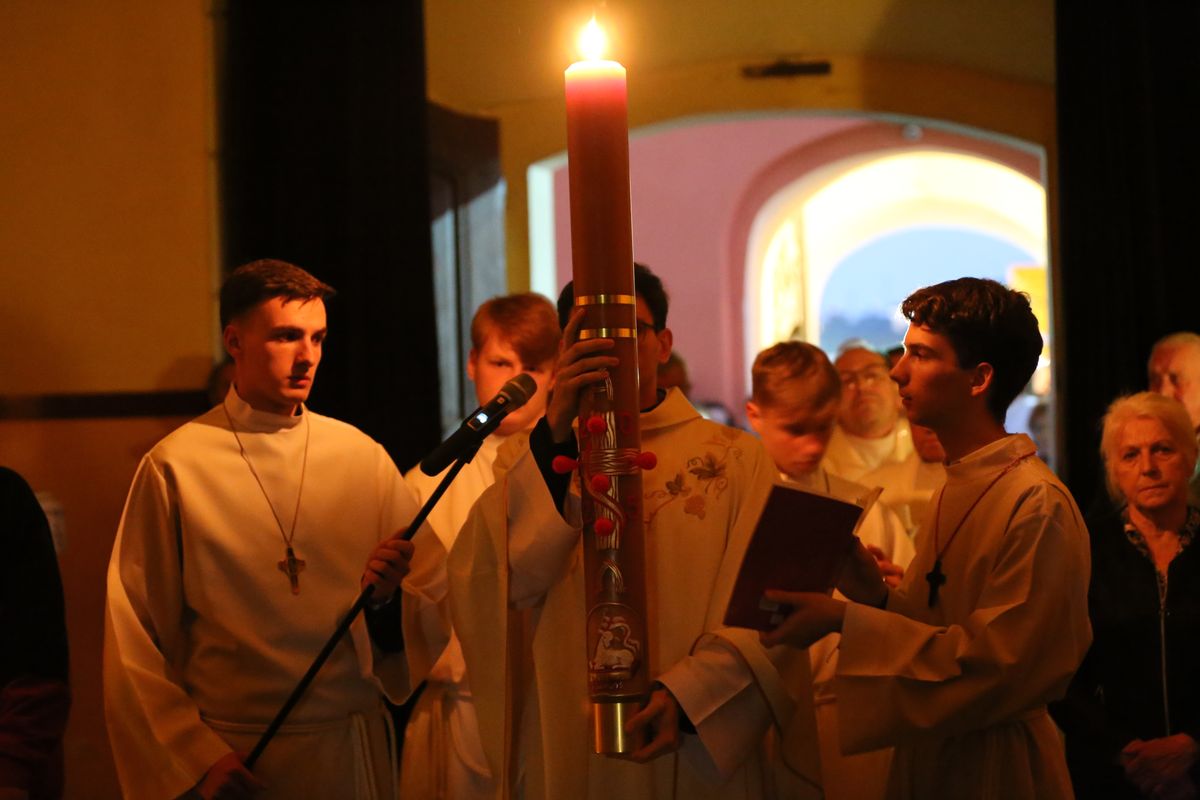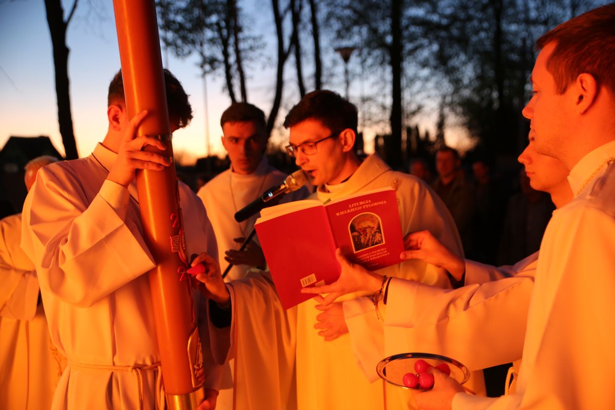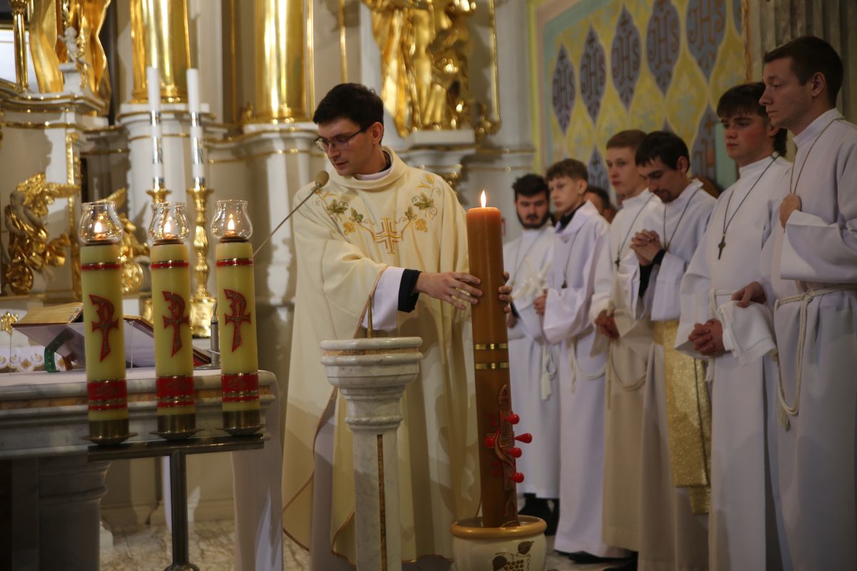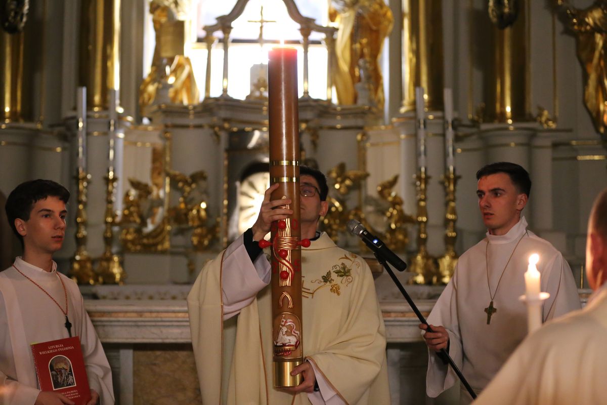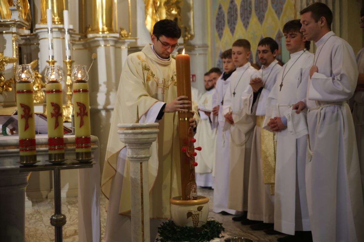 Poświęcenie ognia, wody chrzcielnej i Boże Słowo i Msza św. o tajemnicy zmartwychwstania – to elementy składające się na liturgię Wielkiej Soboty, bogatej w symbole i znaczenia. Liturgii przewodniczył ks. Damian Surowiec, wikariusz parafii wraz ze wszystkimi kapłanami posługującymi w parafii. Wspólną modlitwę chrześcijańskiego czuwania przed zmartwychwstaniem Chrystusa, rozpoczął obrzęd poświęcenia ognia i Paschału. Przy jego świetle i zapalonych przez wiernych świec w świątyni odśpiewano Orędzie Paschalne, wyjaśniające symbolikę światła, którym jest Chrystus powstający z mroku śmierci do życia. Następnie wierni wysłuchali rozbudowanej do kilku czytań Liturgii Słowa. Homilię wygłosił ks. Tomasz Kopeć wskazując na znaczenie liturgii prowadzącej do zrozumienia tajemnicy zmartwychwstania Chrystusa.
