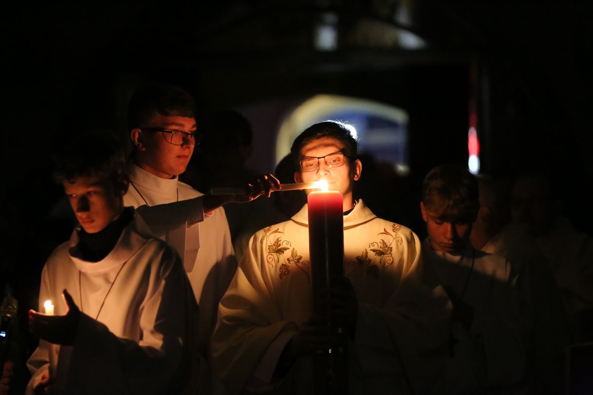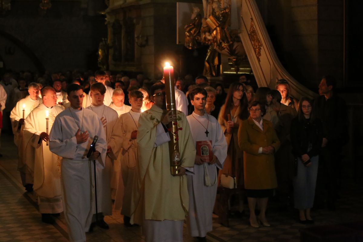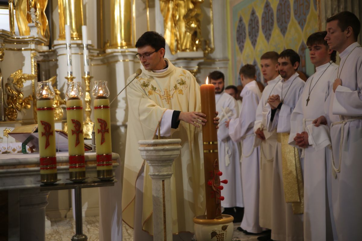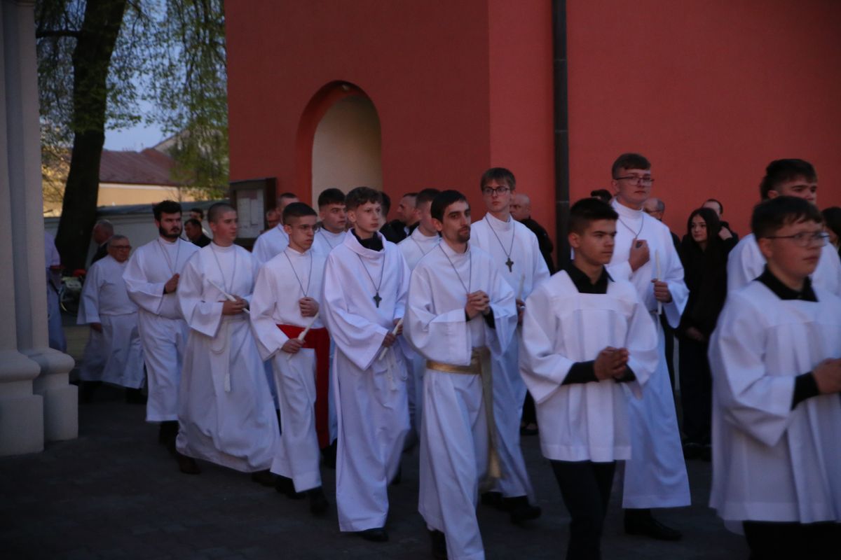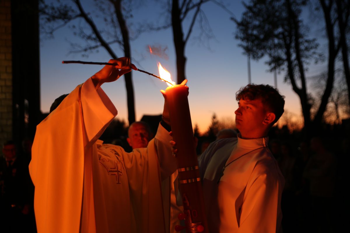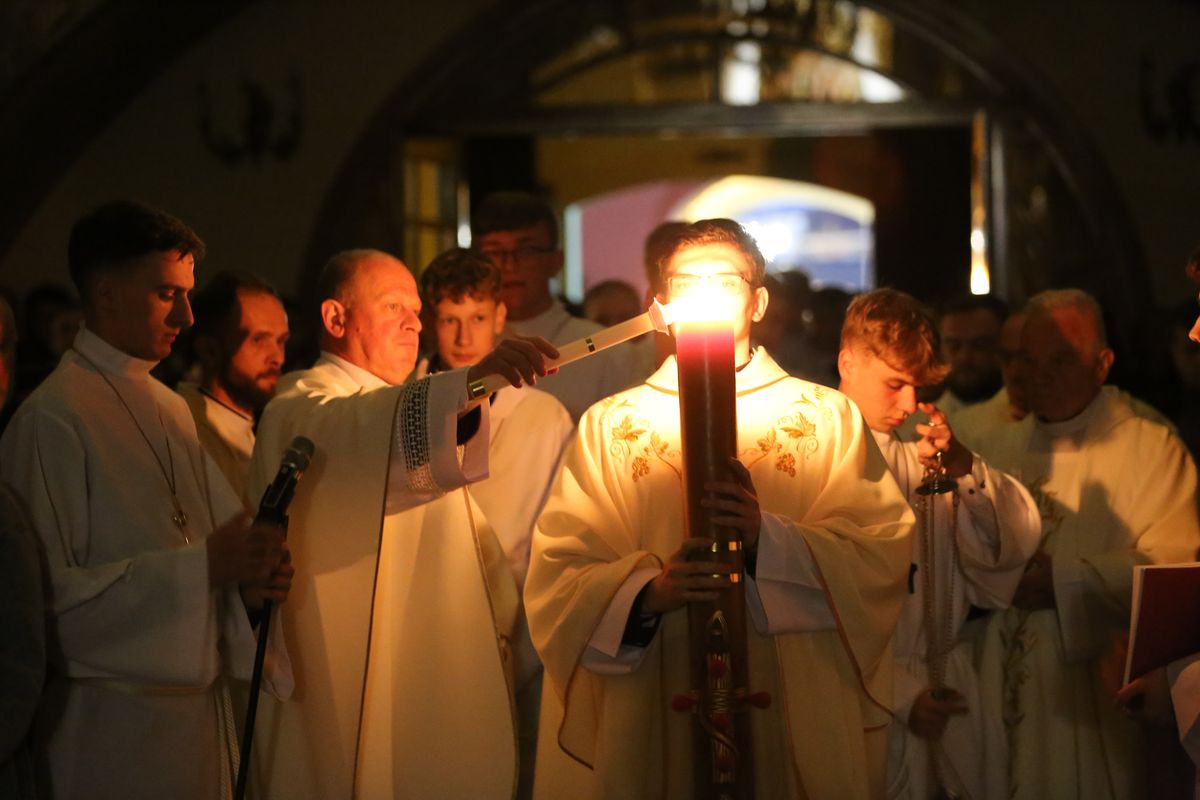 Poświęcenie ognia, wody chrzcielnej i Boże Słowo i Msza św. o tajemnicy zmartwychwstania – to elementy składające się na liturgię Wielkiej Soboty, bogatej w symbole i znaczenia. Liturgii przewodniczył ks. Damian Surowiec, wikariusz parafii wraz ze wszystkimi kapłanami posługującymi w parafii. Wspólną modlitwę chrześcijańskiego czuwania przed zmartwychwstaniem Chrystusa, rozpoczął obrzęd poświęcenia ognia i Paschału. Przy jego świetle i zapalonych przez wiernych świec w świątyni odśpiewano Orędzie Paschalne, wyjaśniające symbolikę światła, którym jest Chrystus powstający z mroku śmierci do życia. Następnie wierni wysłuchali rozbudowanej do kilku czytań Liturgii Słowa. Homilię wygłosił ks. Tomasz Kopeć wskazując na znaczenie liturgii prowadzącej do zrozumienia tajemnicy zmartwychwstania Chrystusa.