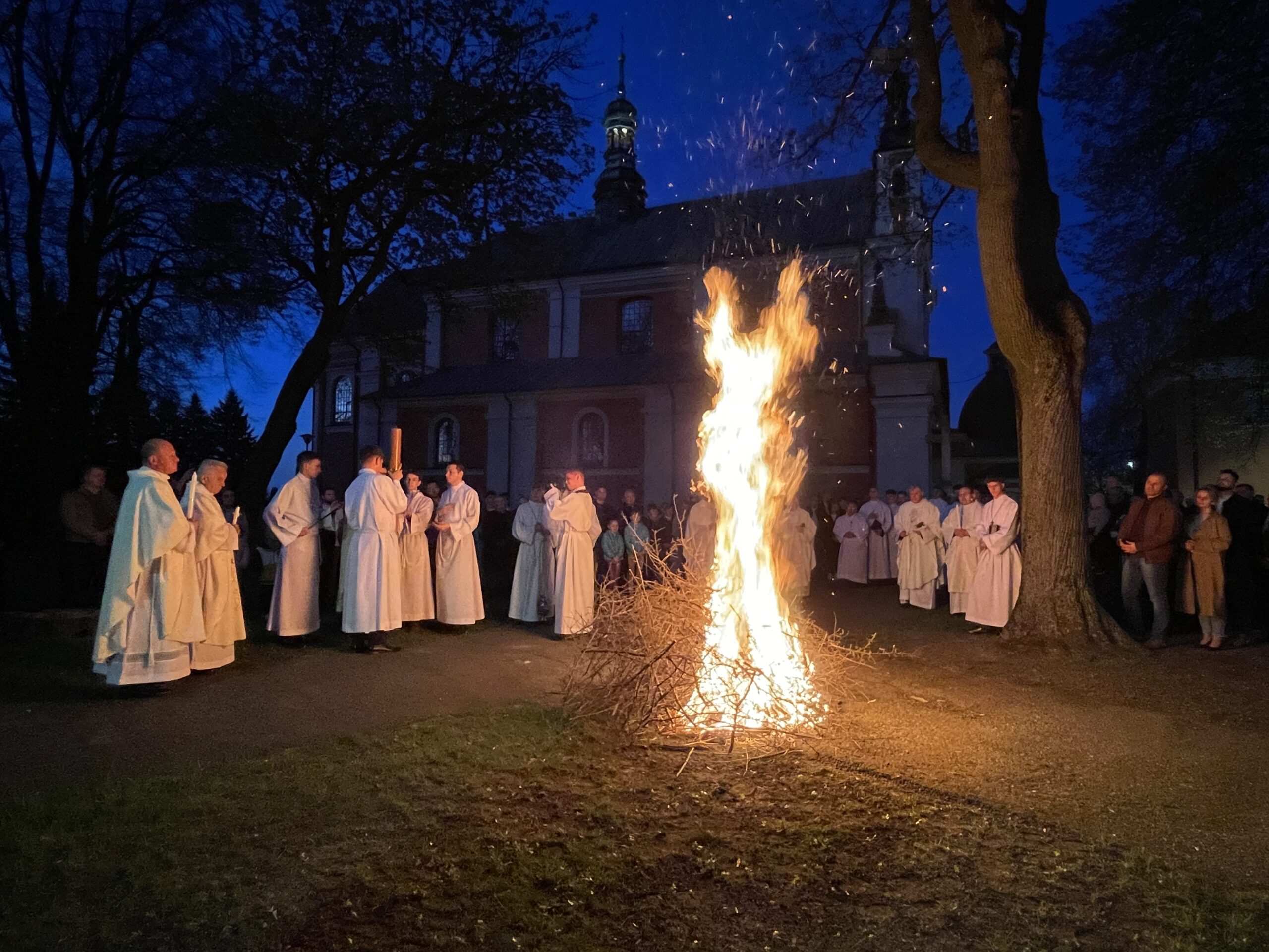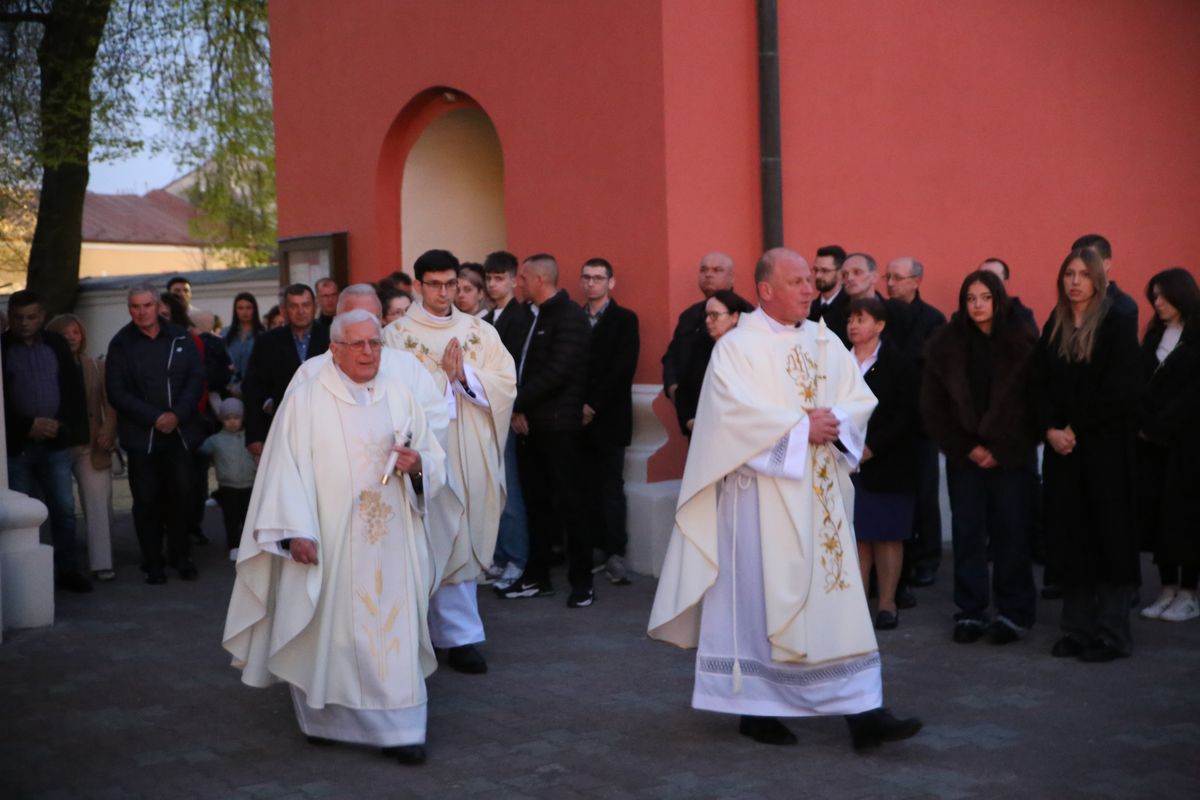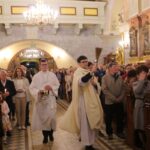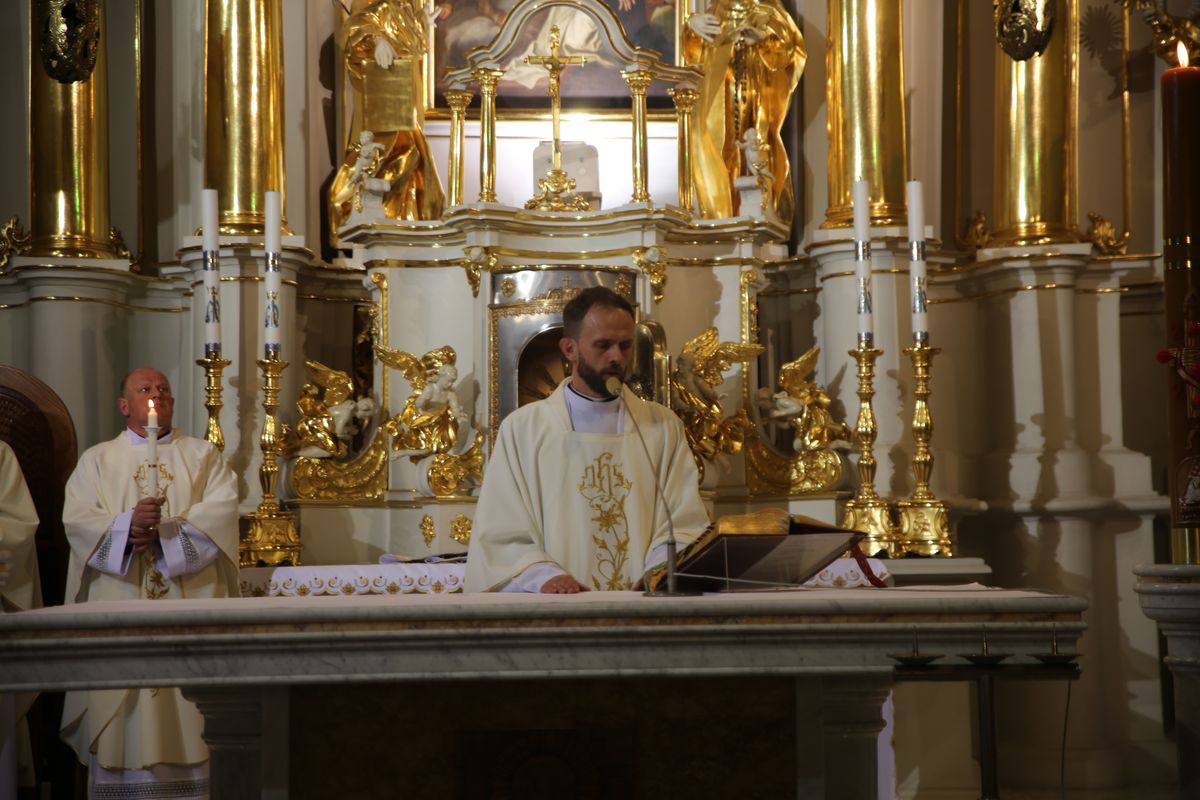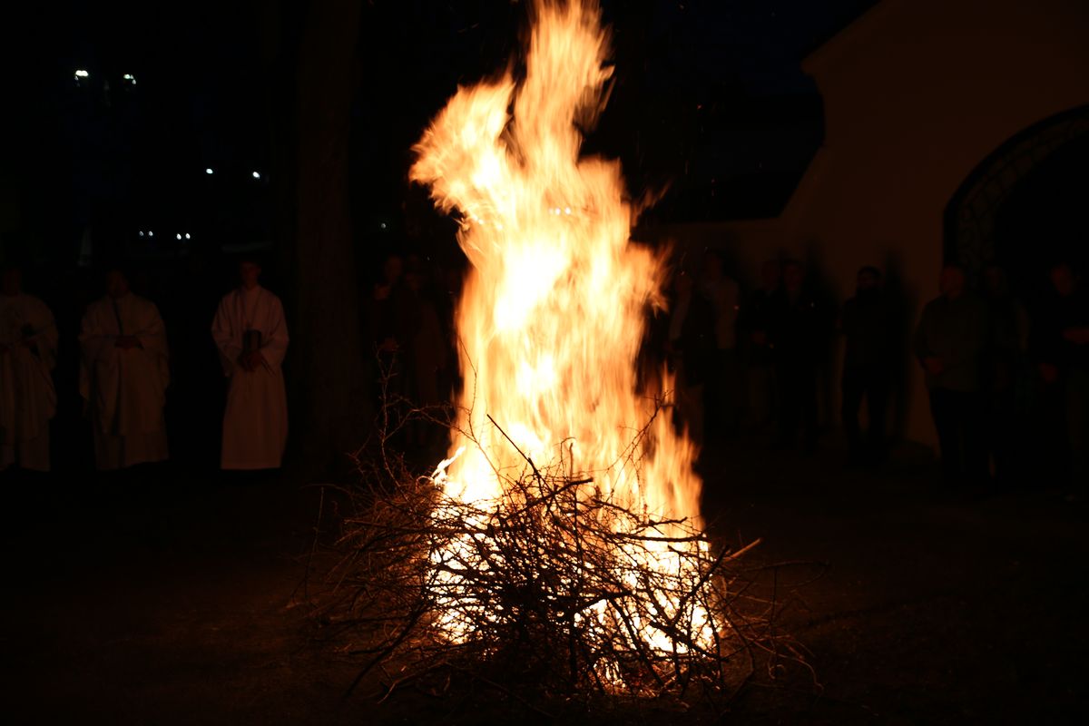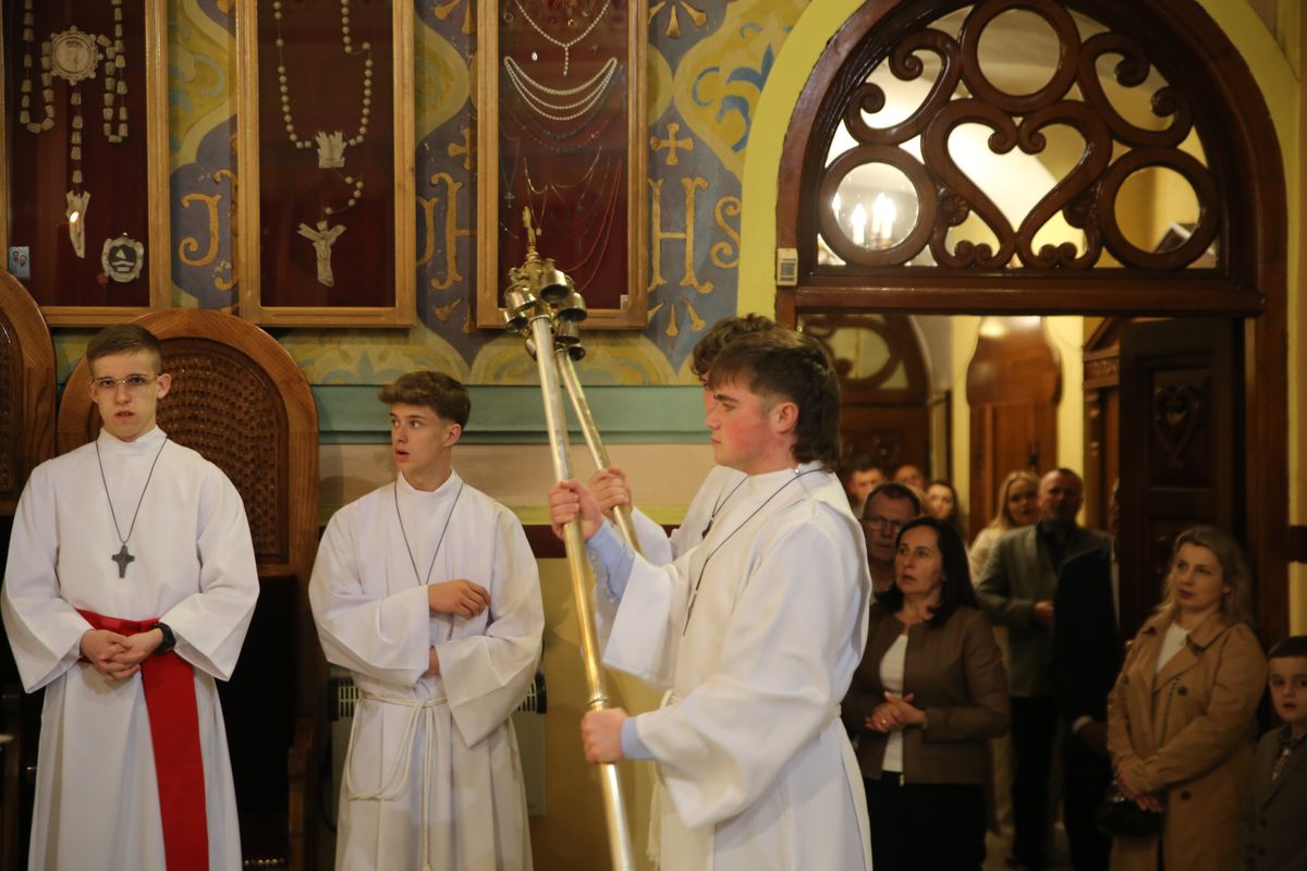 Poświęcenie ognia, wody chrzcielnej i Boże Słowo i Msza św. o tajemnicy zmartwychwstania – to elementy składające się na liturgię Wielkiej Soboty, bogatej w symbole i znaczenia. Liturgii przewodniczył ks. Damian Surowiec, wikariusz parafii wraz ze wszystkimi kapłanami posługującymi w parafii. Wspólną modlitwę chrześcijańskiego czuwania przed zmartwychwstaniem Chrystusa, rozpoczął obrzęd poświęcenia ognia i Paschału. Przy jego świetle i zapalonych przez wiernych świec w świątyni odśpiewano Orędzie Paschalne, wyjaśniające symbolikę światła, którym jest Chrystus powstający z mroku śmierci do życia. Następnie wierni wysłuchali rozbudowanej do kilku czytań Liturgii Słowa. Homilię wygłosił ks. Tomasz Kopeć wskazując na znaczenie liturgii prowadzącej do zrozumienia tajemnicy zmartwychwstania Chrystusa.