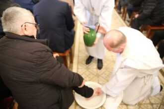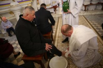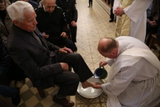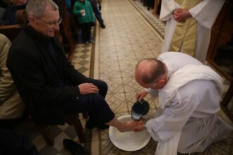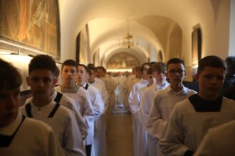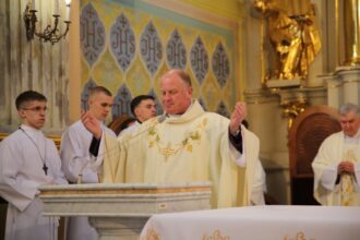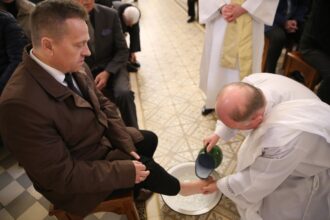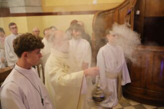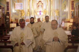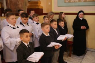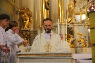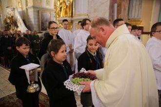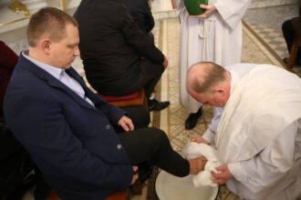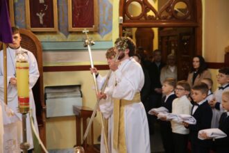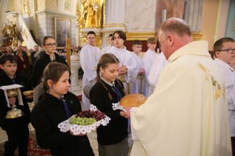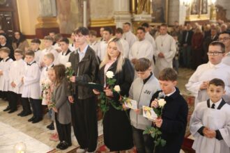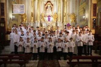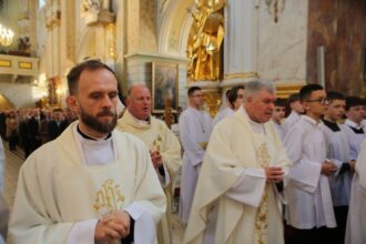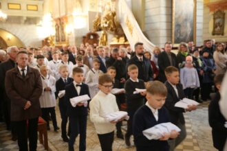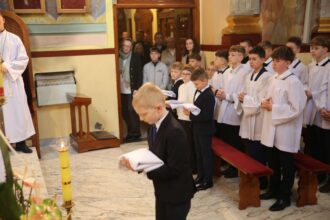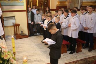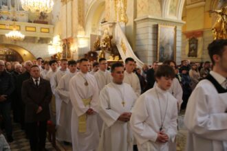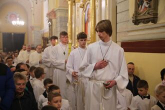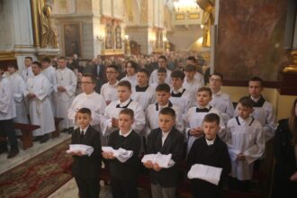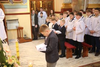 Wieczorem w Wielki Czwartek sprawowana była w naszym sanktuarium Msza św. Wieczerzy Pańskiej w której dziękowaliśmy Bogu za dar ustanowienia sakramentów Eucharystii i kapłaństwa. Liturgii przewodniczył ks. Tomasz Lis, proboszcz wraz z nim Mszę św. koncelebrowali wszyscy kapłani posługujący w naszym sanktuarium. Podczas liturgii do grona ministrantów zostało włączonych 8 chłopców, którzy przez kilka miesięcy, jako kandydaci, przygotowywali się do tej posługi liturgicznej. – Kandydaci do grona ministrantów rozpoczęli swoje przygotowania we wrześniu. W trakcie spotkań uczyli się, jak wygląda posługa ministranta podczas Mszy Świętej, poznawali nazwy poszczególnych jej części oraz paramentów liturgicznych. Zdobywali także praktyczne umiejętności związane ze służeniem przy ołtarzu. Formacja nie ograniczała się jednak wyłącznie do wiedzy i praktyki liturgicznej. Kandydaci uczyli się również współpracy, odpowiedzialności oraz wzajemnego wsparcia, co jest nieodłącznym elementem wspólnej służby – mówił ks. Tomasz Kopeć, wikariusz zajmujący formacją Liturgicznej Służby Ołtarza.