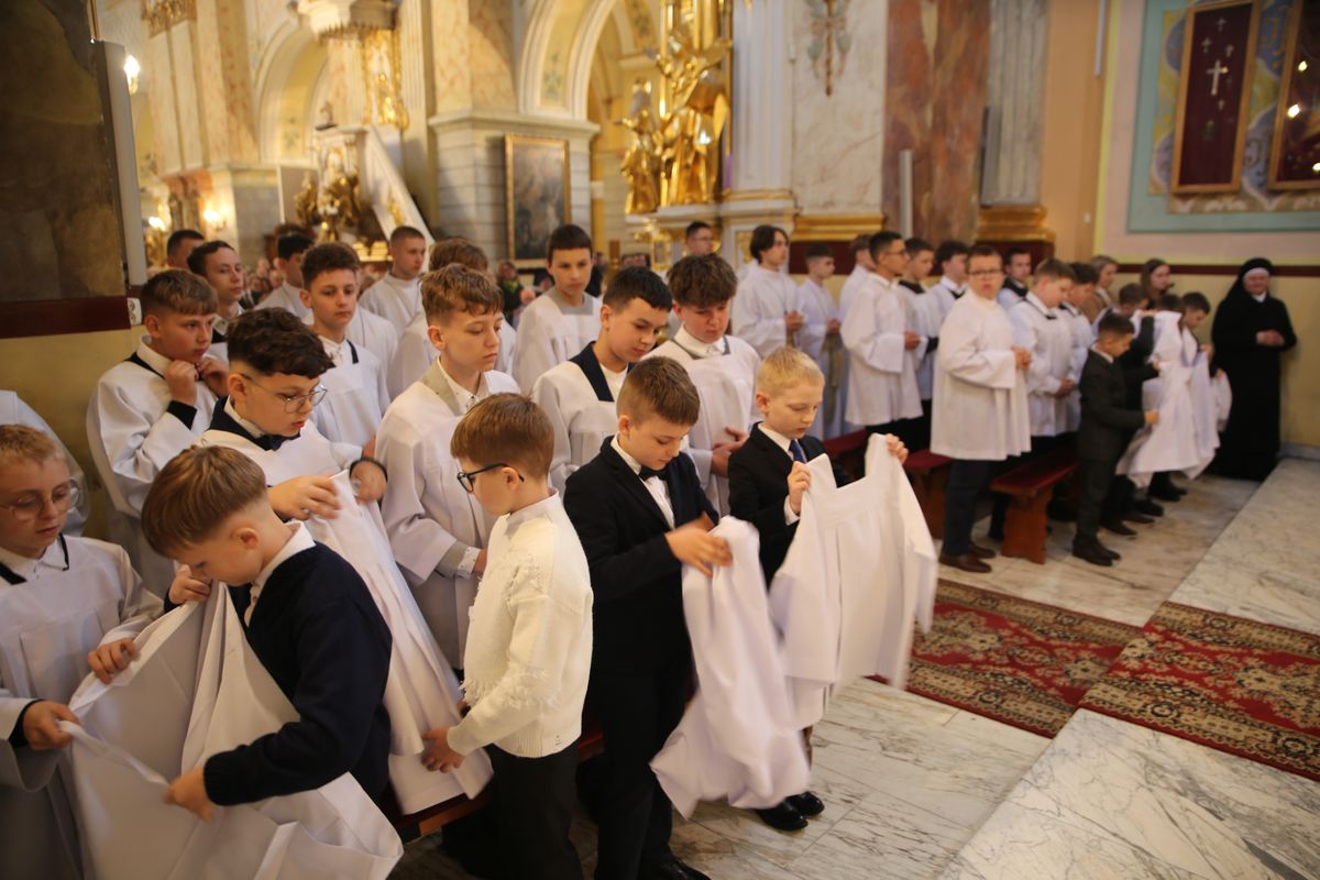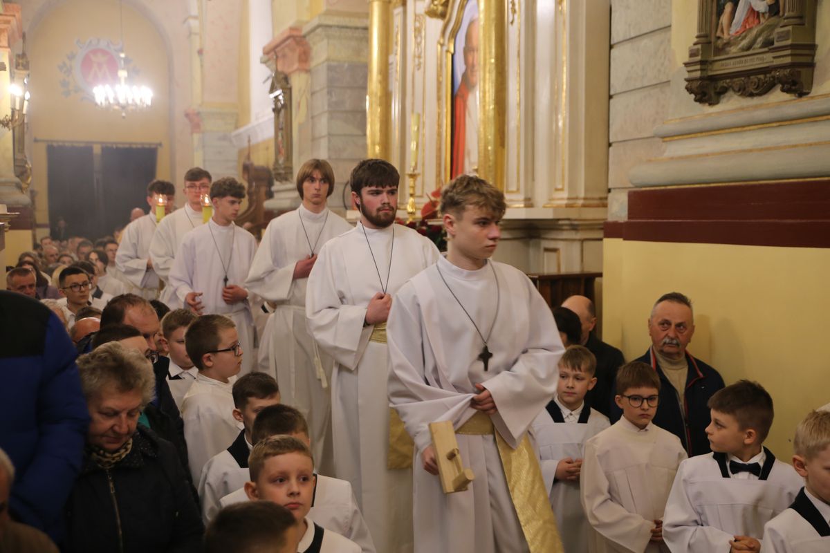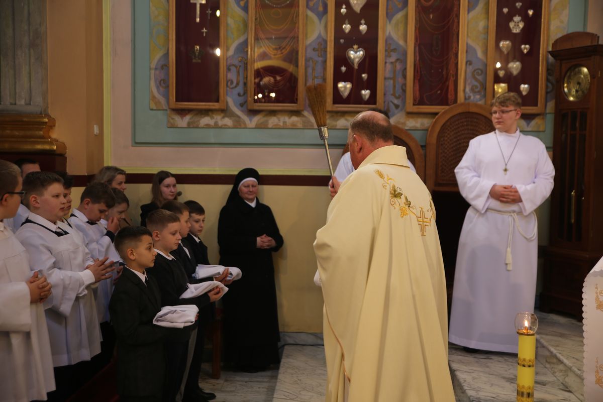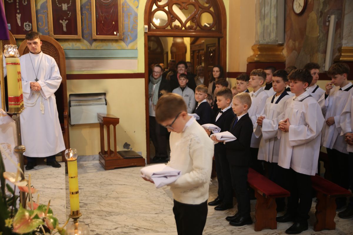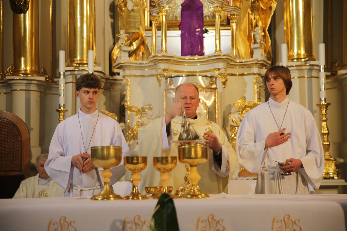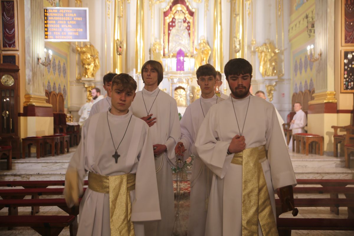 Wieczorem w Wielki Czwartek sprawowana była w naszym sanktuarium Msza św. Wieczerzy Pańskiej w której dziękowaliśmy Bogu za dar ustanowienia sakramentów Eucharystii i kapłaństwa. Liturgii przewodniczył ks. Tomasz Lis, proboszcz wraz z nim Mszę św. koncelebrowali wszyscy kapłani posługujący w naszym sanktuarium. Podczas liturgii do grona ministrantów zostało włączonych 8 chłopców, którzy przez kilka miesięcy, jako kandydaci, przygotowywali się do tej posługi liturgicznej. – Kandydaci do grona ministrantów rozpoczęli swoje przygotowania we wrześniu. W trakcie spotkań uczyli się, jak wygląda posługa ministranta podczas Mszy Świętej, poznawali nazwy poszczególnych jej części oraz paramentów liturgicznych. Zdobywali także praktyczne umiejętności związane ze służeniem przy ołtarzu. Formacja nie ograniczała się jednak wyłącznie do wiedzy i praktyki liturgicznej. Kandydaci uczyli się również współpracy, odpowiedzialności oraz wzajemnego wsparcia, co jest nieodłącznym elementem wspólnej służby – mówił ks. Tomasz Kopeć, wikariusz zajmujący formacją Liturgicznej Służby Ołtarza.