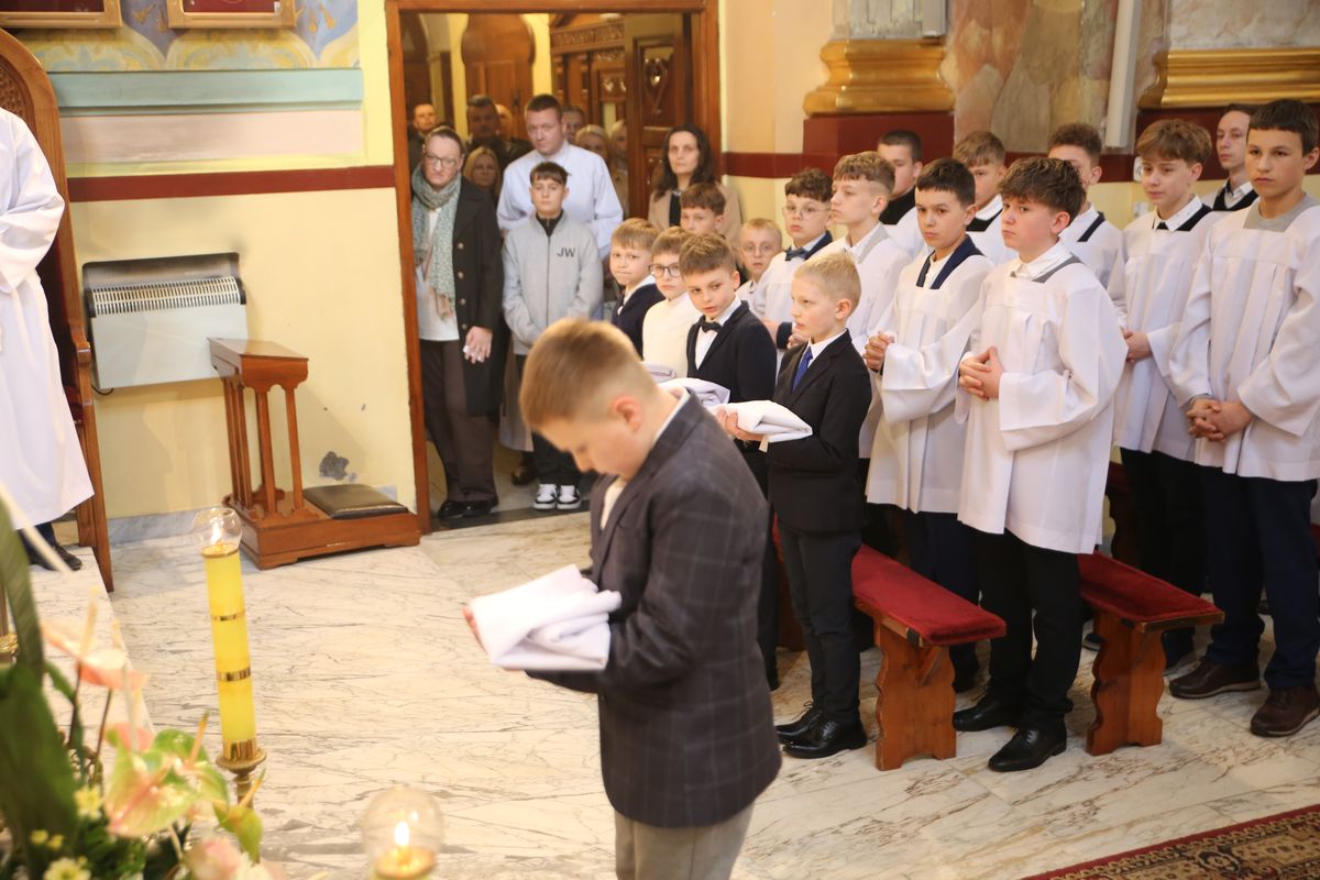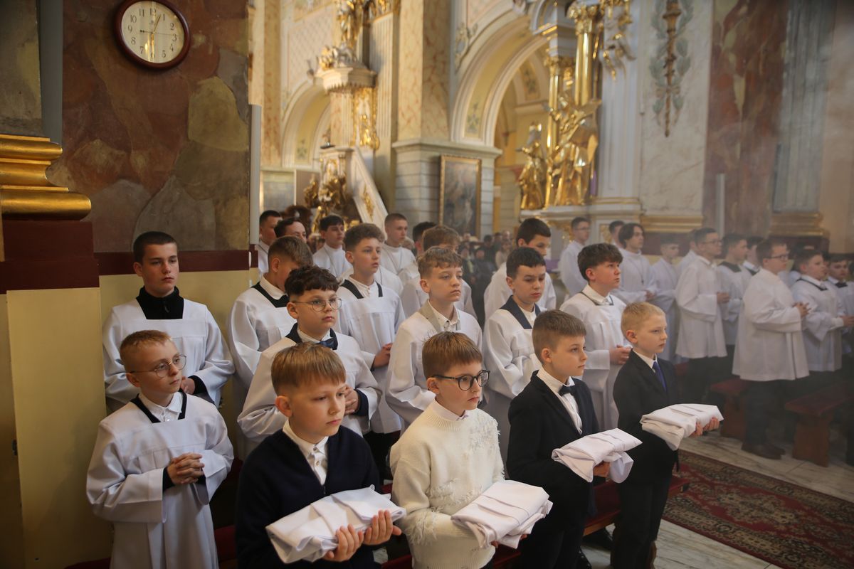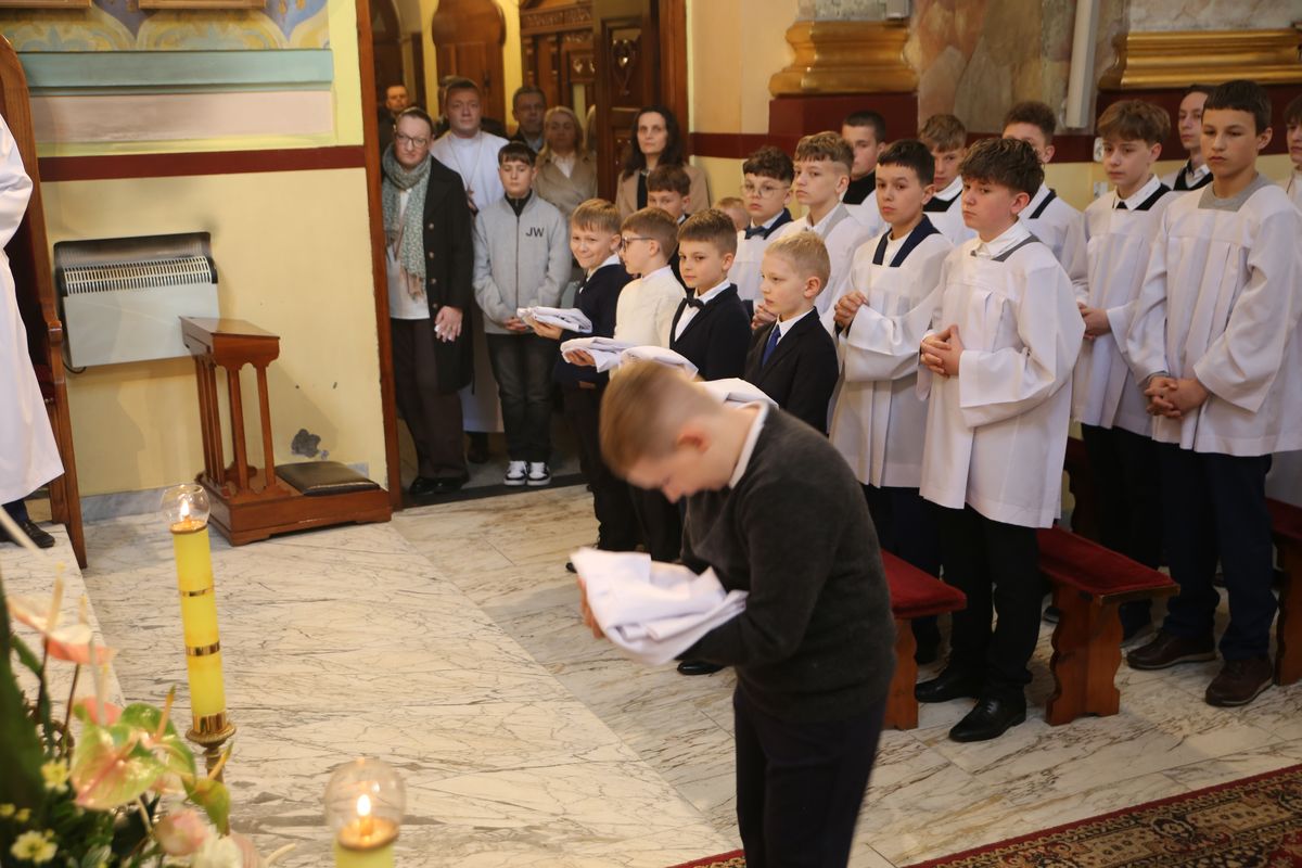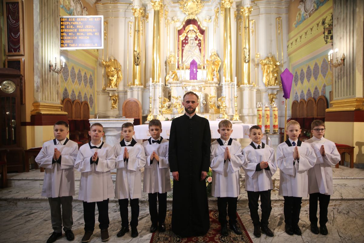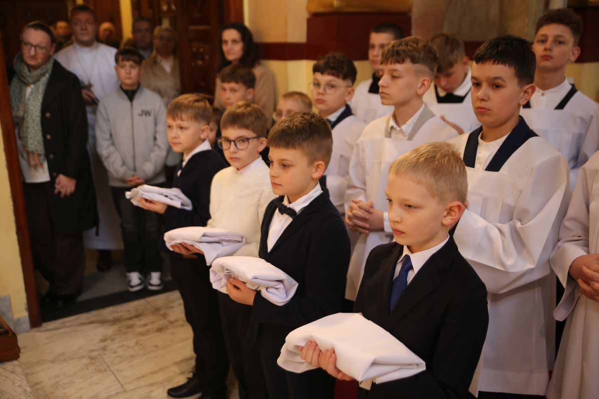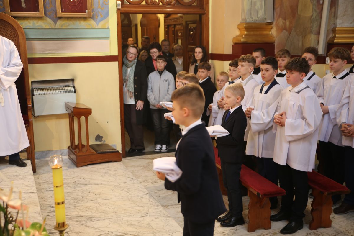 Wieczorem w Wielki Czwartek sprawowana była w naszym sanktuarium Msza św. Wieczerzy Pańskiej w której dziękowaliśmy Bogu za dar ustanowienia sakramentów Eucharystii i kapłaństwa. Liturgii przewodniczył ks. Tomasz Lis, proboszcz wraz z nim Mszę św. koncelebrowali wszyscy kapłani posługujący w naszym sanktuarium. Podczas liturgii do grona ministrantów zostało włączonych 8 chłopców, którzy przez kilka miesięcy, jako kandydaci, przygotowywali się do tej posługi liturgicznej. – Kandydaci do grona ministrantów rozpoczęli swoje przygotowania we wrześniu. W trakcie spotkań uczyli się, jak wygląda posługa ministranta podczas Mszy Świętej, poznawali nazwy poszczególnych jej części oraz paramentów liturgicznych. Zdobywali także praktyczne umiejętności związane ze służeniem przy ołtarzu. Formacja nie ograniczała się jednak wyłącznie do wiedzy i praktyki liturgicznej. Kandydaci uczyli się również współpracy, odpowiedzialności oraz wzajemnego wsparcia, co jest nieodłącznym elementem wspólnej służby – mówił ks. Tomasz Kopeć, wikariusz zajmujący formacją Liturgicznej Służby Ołtarza.