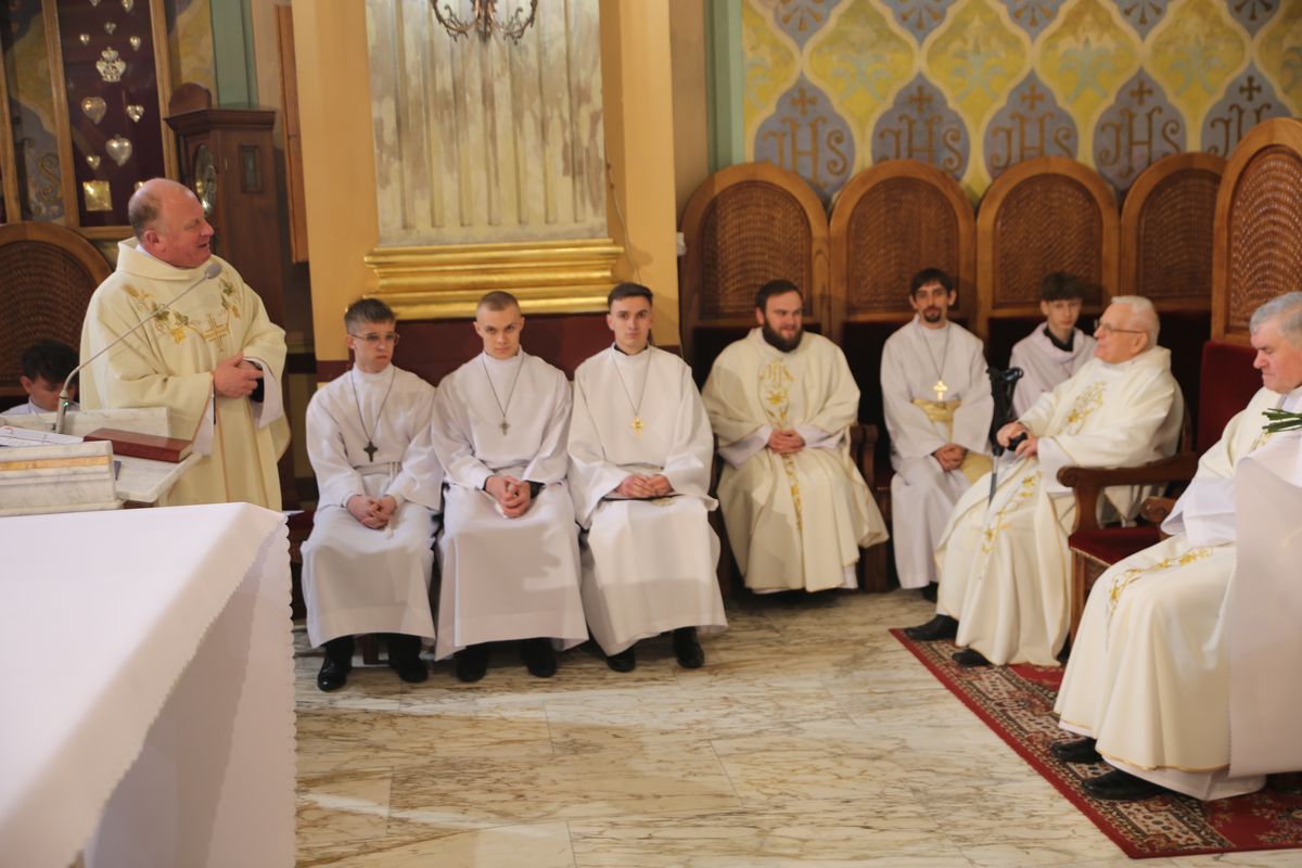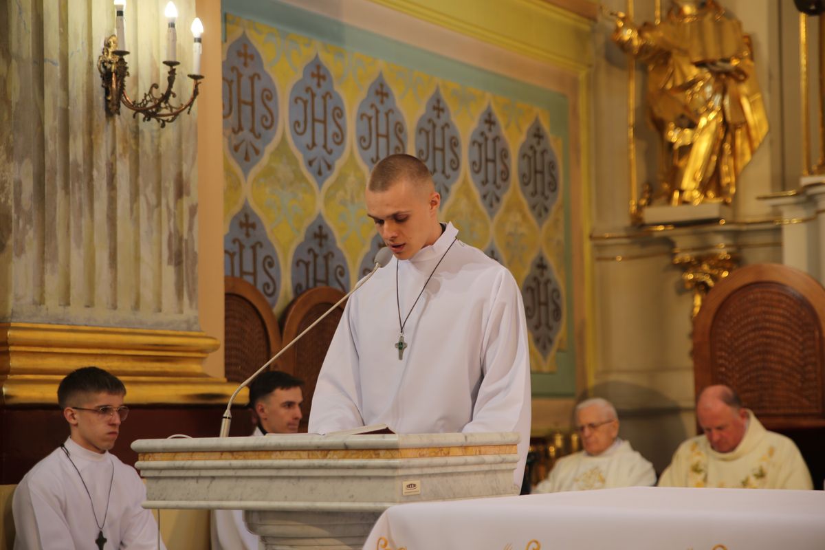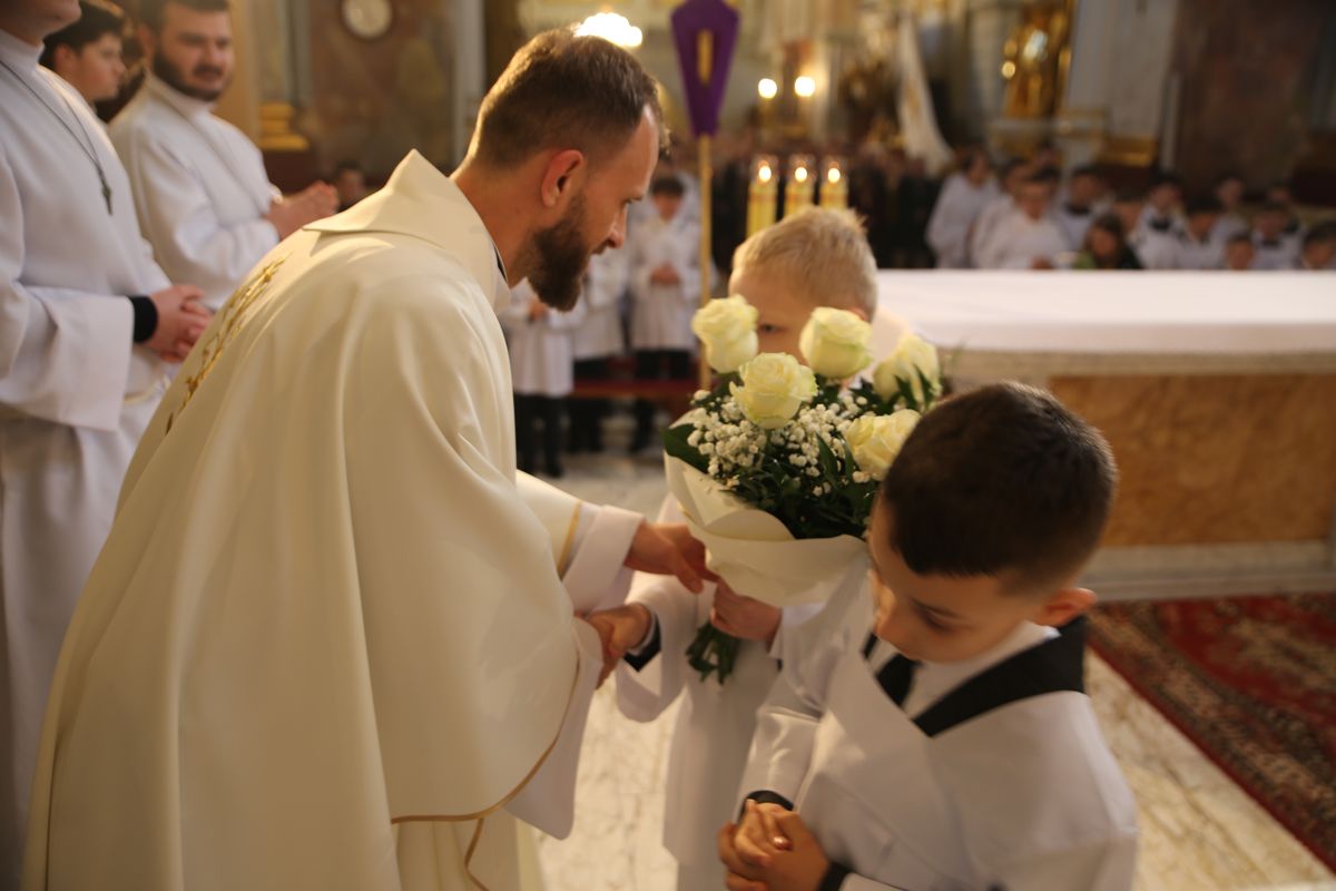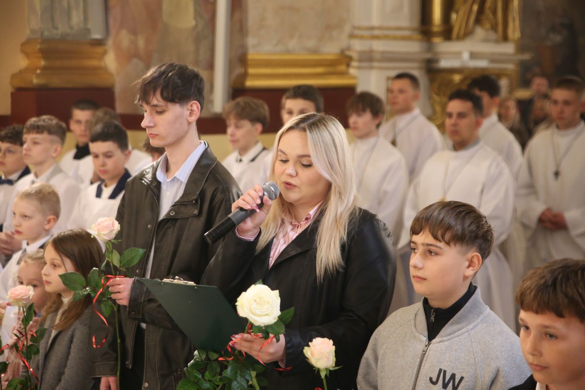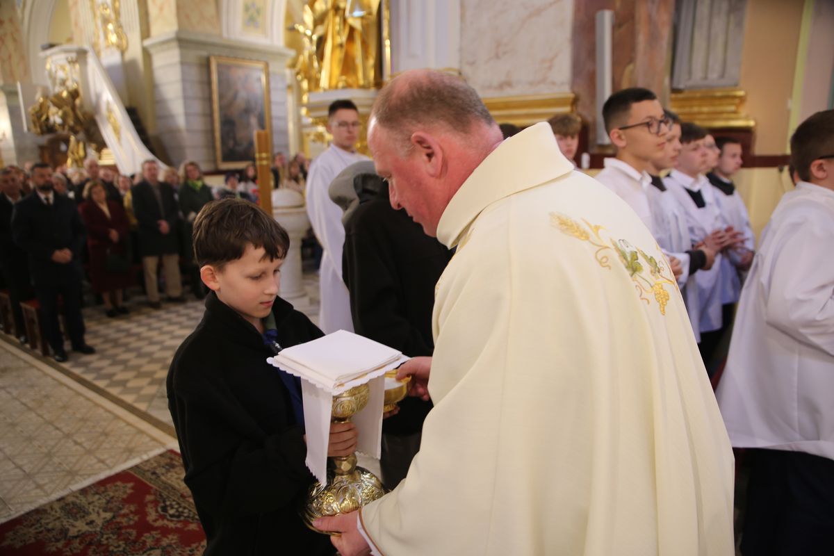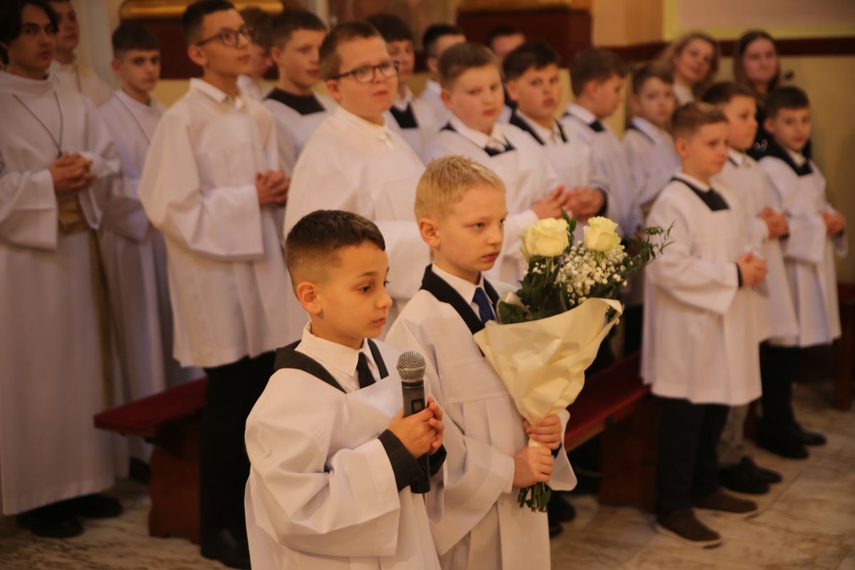 Wieczorem w Wielki Czwartek sprawowana była w naszym sanktuarium Msza św. Wieczerzy Pańskiej w której dziękowaliśmy Bogu za dar ustanowienia sakramentów Eucharystii i kapłaństwa. Liturgii przewodniczył ks. Tomasz Lis, proboszcz wraz z nim Mszę św. koncelebrowali wszyscy kapłani posługujący w naszym sanktuarium. Podczas liturgii do grona ministrantów zostało włączonych 8 chłopców, którzy przez kilka miesięcy, jako kandydaci, przygotowywali się do tej posługi liturgicznej. – Kandydaci do grona ministrantów rozpoczęli swoje przygotowania we wrześniu. W trakcie spotkań uczyli się, jak wygląda posługa ministranta podczas Mszy Świętej, poznawali nazwy poszczególnych jej części oraz paramentów liturgicznych. Zdobywali także praktyczne umiejętności związane ze służeniem przy ołtarzu. Formacja nie ograniczała się jednak wyłącznie do wiedzy i praktyki liturgicznej. Kandydaci uczyli się również współpracy, odpowiedzialności oraz wzajemnego wsparcia, co jest nieodłącznym elementem wspólnej służby – mówił ks. Tomasz Kopeć, wikariusz zajmujący formacją Liturgicznej Służby Ołtarza.