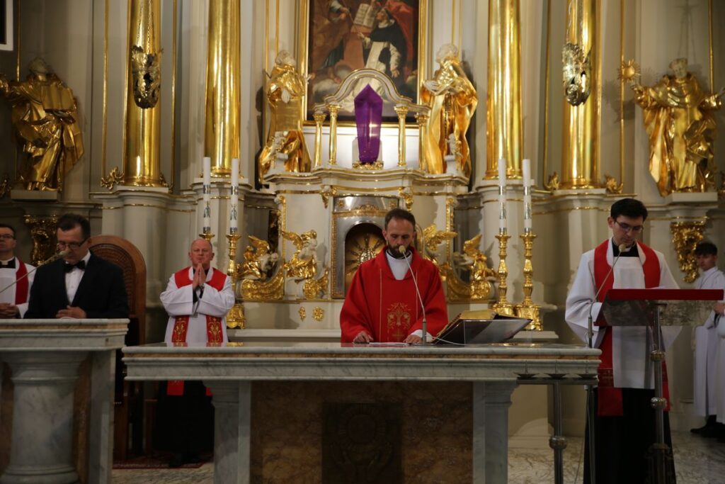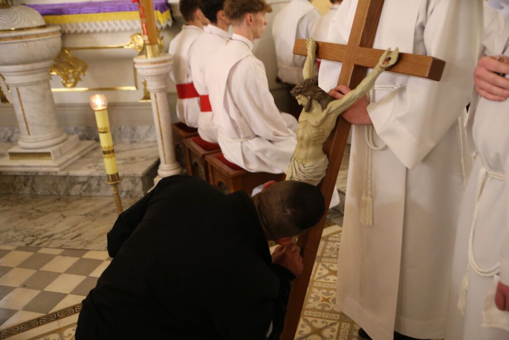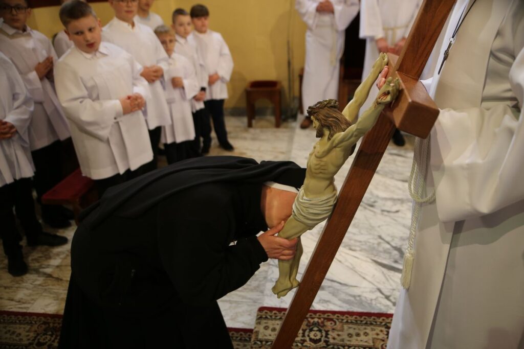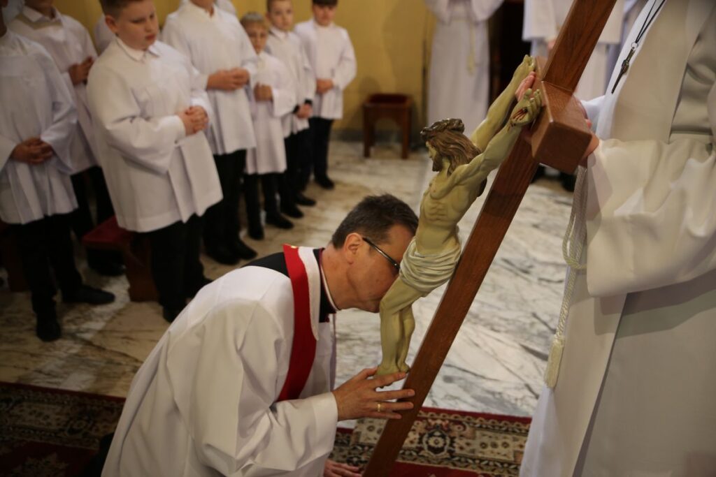 Po zakończeniu nabożeństwa pasyjnego rozpoczęła się Liturgia Wielkiego Piątku, którą rozpoczęło procesjonalne wejście asysty liturgicznej wraz z kapłanami w ciszy do świątyni. Na początku nabożeństwa ks. Tomasz Kopeć, który przewodniczył liturgii, leżał krzyżem na posadzce kościoła na znak uniżenia jakie Jezus podjął podczas swojej męki i śmierci na krzyżu. Uwieńczeniem liturgii Słowa Bożego było odśpiewanie Męki Pańskiej.