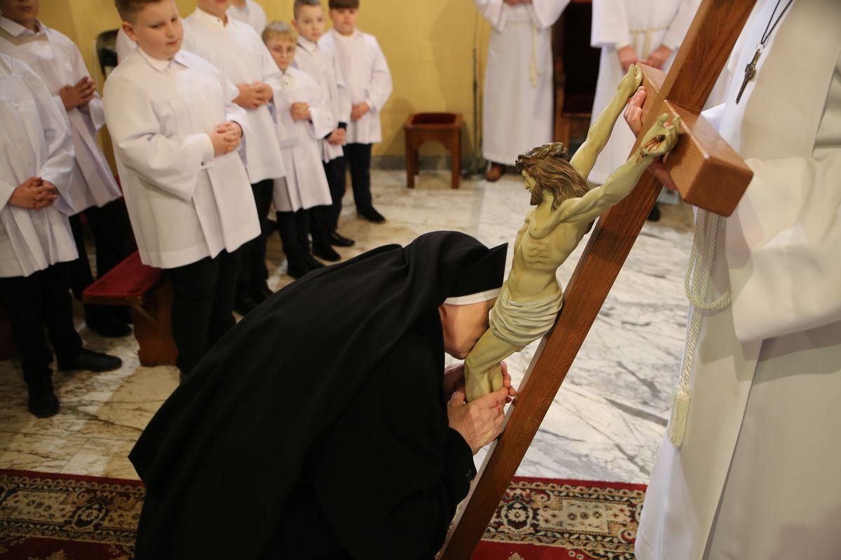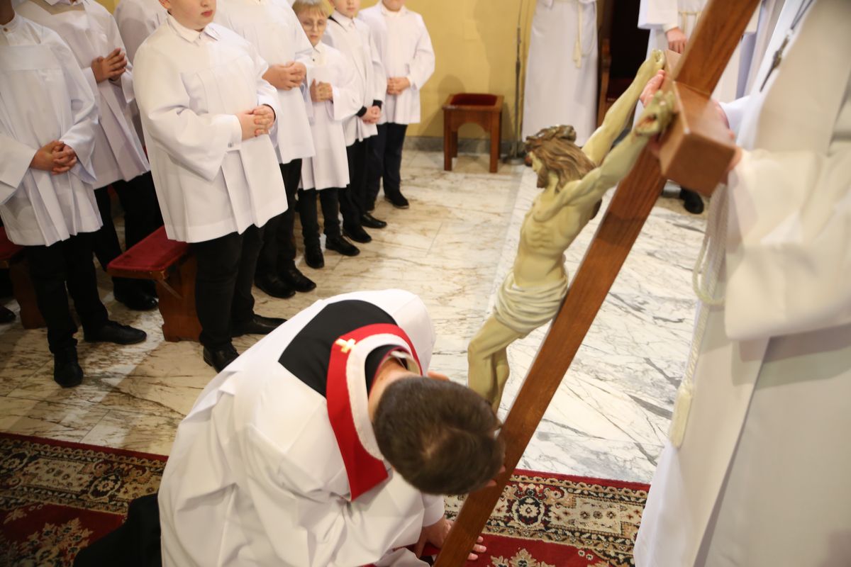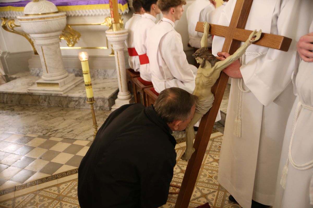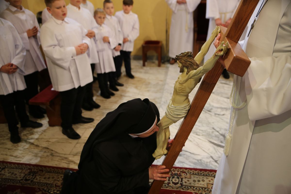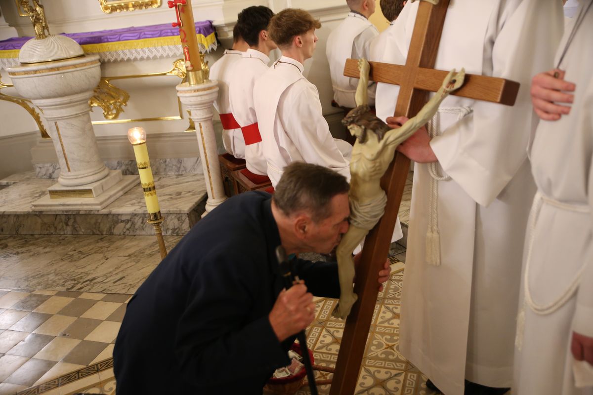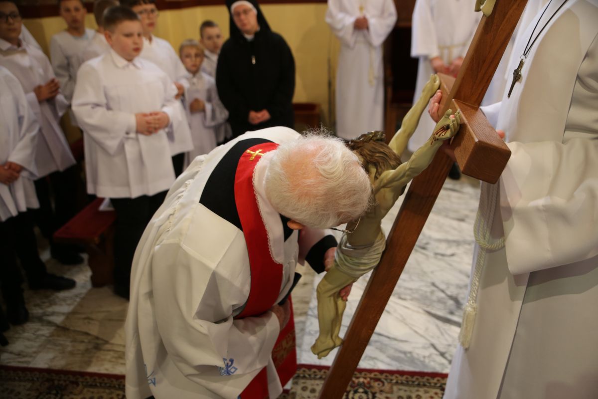 Po zakończeniu nabożeństwa pasyjnego rozpoczęła się Liturgia Wielkiego Piątku, którą rozpoczęło procesjonalne wejście asysty liturgicznej wraz z kapłanami w ciszy do świątyni. Na początku nabożeństwa ks. Tomasz Kopeć, który przewodniczył liturgii, leżał krzyżem na posadzce kościoła na znak uniżenia jakie Jezus podjął podczas swojej męki i śmierci na krzyżu. Uwieńczeniem liturgii Słowa Bożego było odśpiewanie Męki Pańskiej.