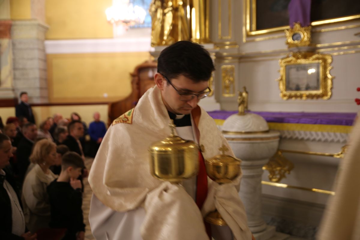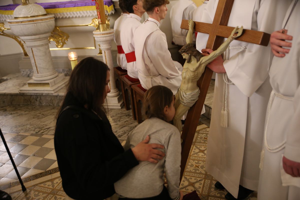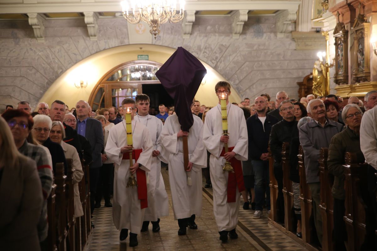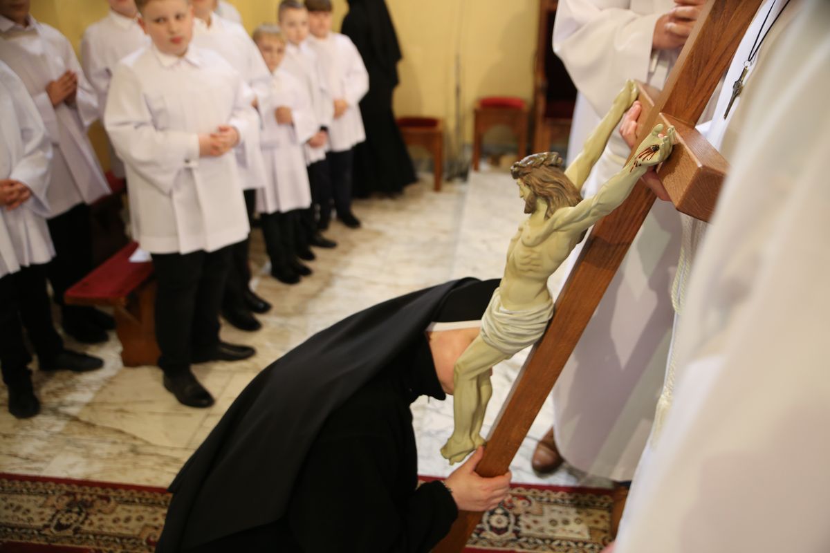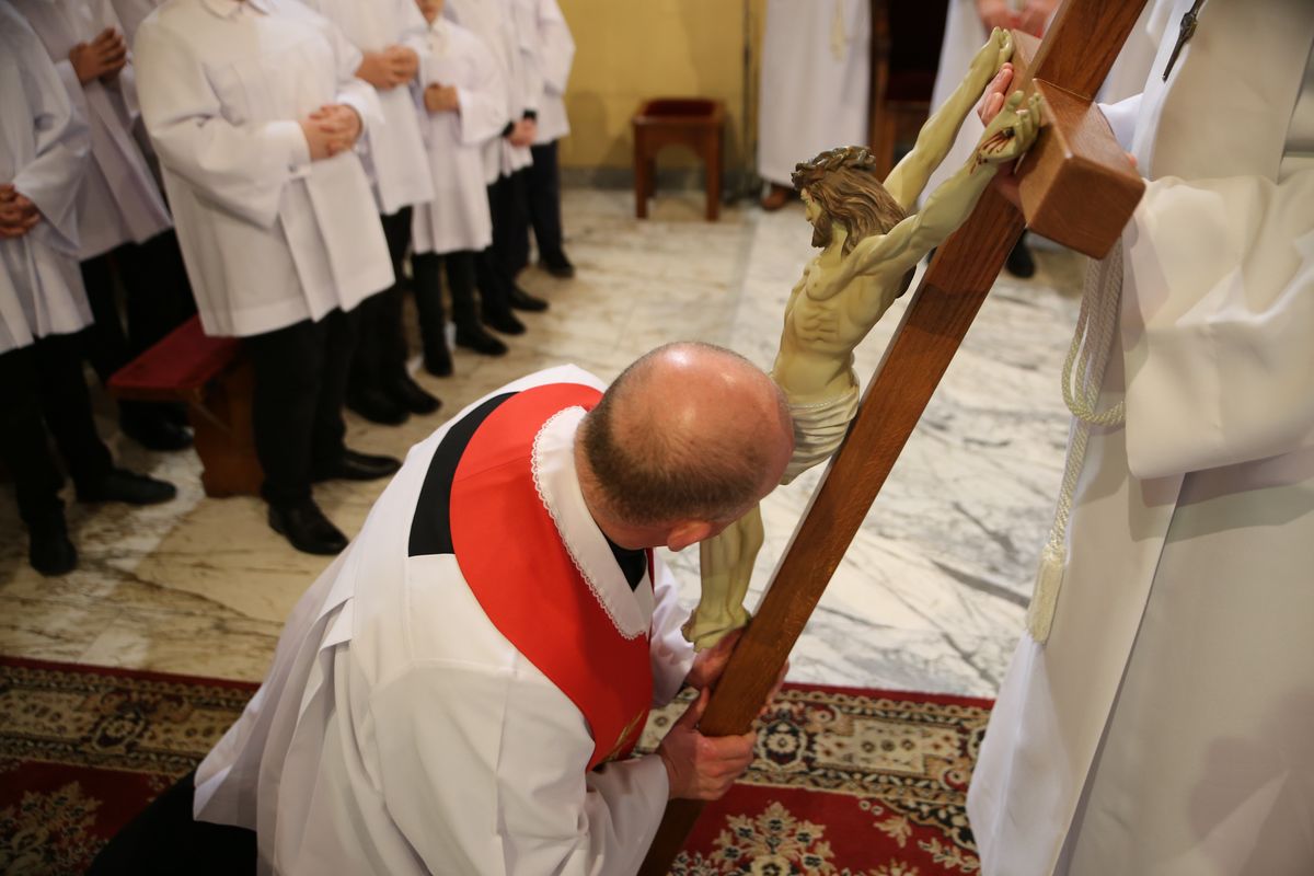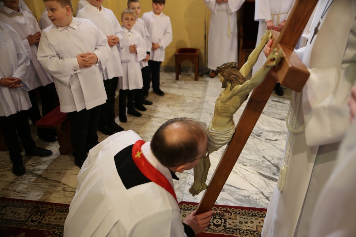 Po zakończeniu nabożeństwa pasyjnego rozpoczęła się Liturgia Wielkiego Piątku, którą rozpoczęło procesjonalne wejście asysty liturgicznej wraz z kapłanami w ciszy do świątyni. Na początku nabożeństwa ks. Tomasz Kopeć, który przewodniczył liturgii, leżał krzyżem na posadzce kościoła na znak uniżenia jakie Jezus podjął podczas swojej męki i śmierci na krzyżu. Uwieńczeniem liturgii Słowa Bożego było odśpiewanie Męki Pańskiej.