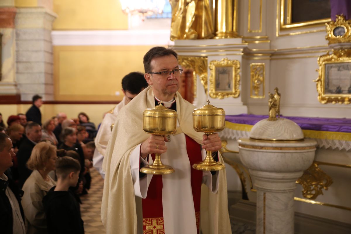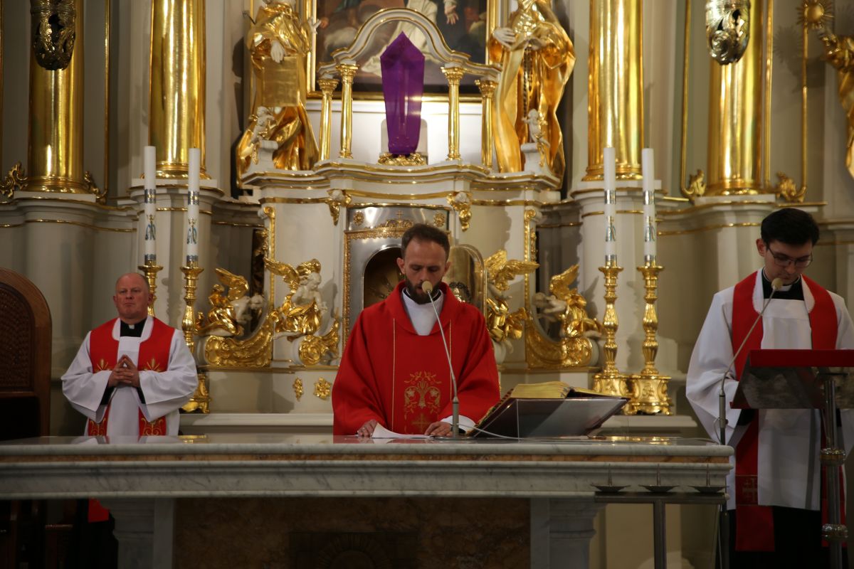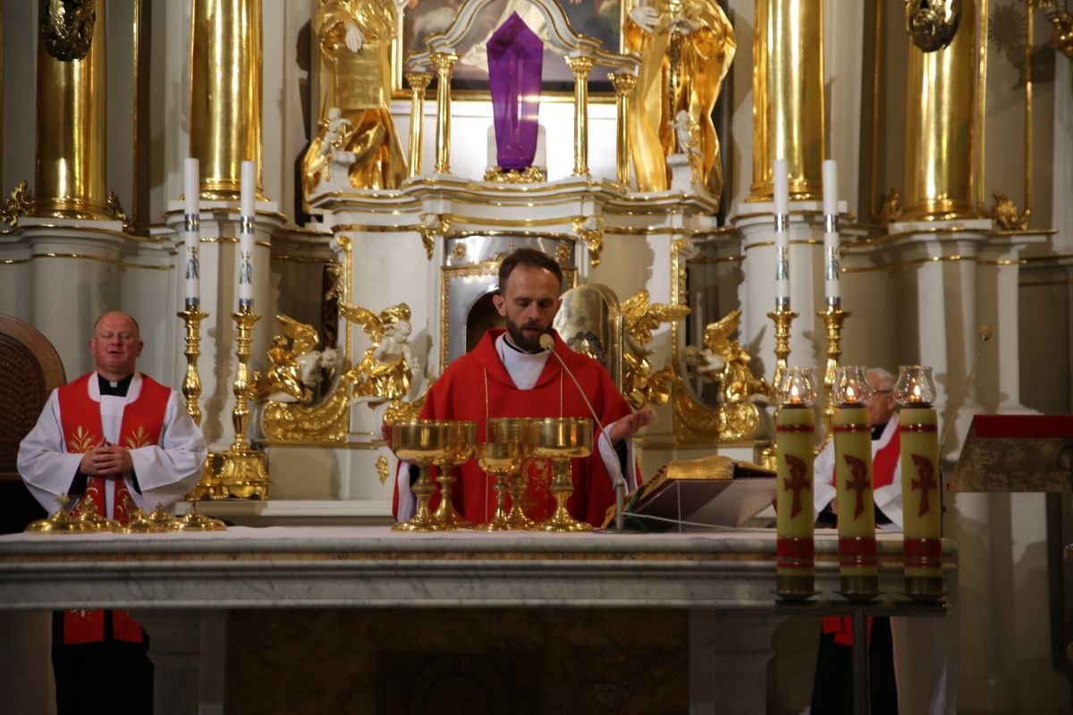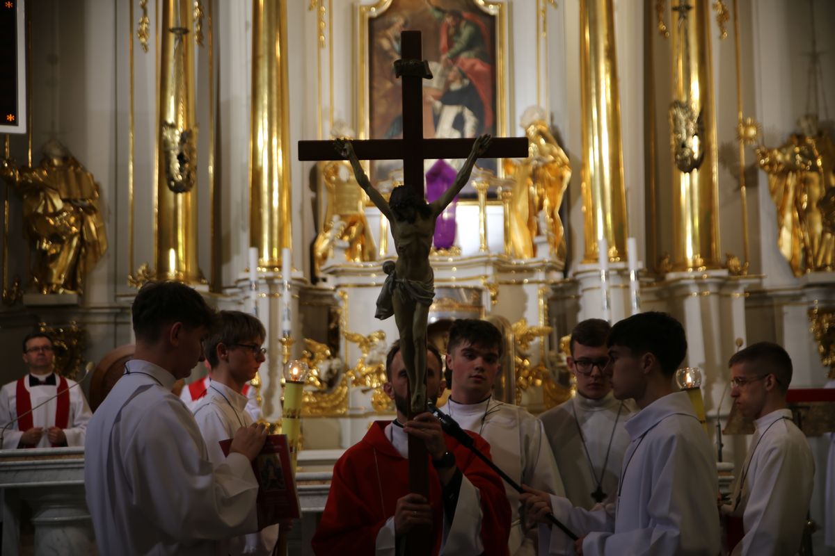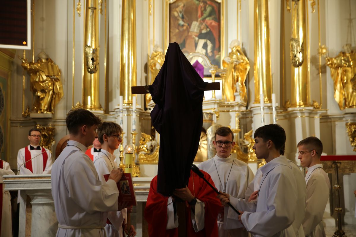 Po zakończeniu nabożeństwa pasyjnego rozpoczęła się Liturgia Wielkiego Piątku, którą rozpoczęło procesjonalne wejście asysty liturgicznej wraz z kapłanami w ciszy do świątyni. Na początku nabożeństwa ks. Tomasz Kopeć, który przewodniczył liturgii, leżał krzyżem na posadzce kościoła na znak uniżenia jakie Jezus podjął podczas swojej męki i śmierci na krzyżu. Uwieńczeniem liturgii Słowa Bożego było odśpiewanie Męki Pańskiej.