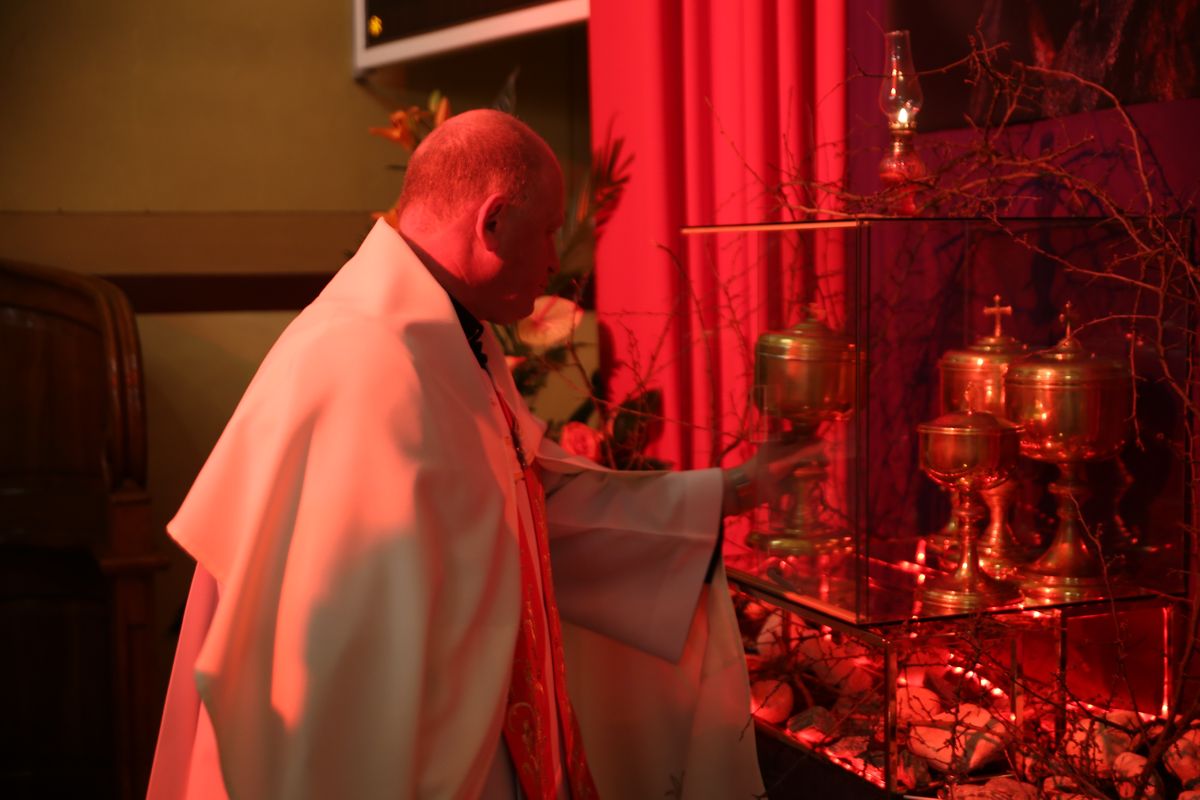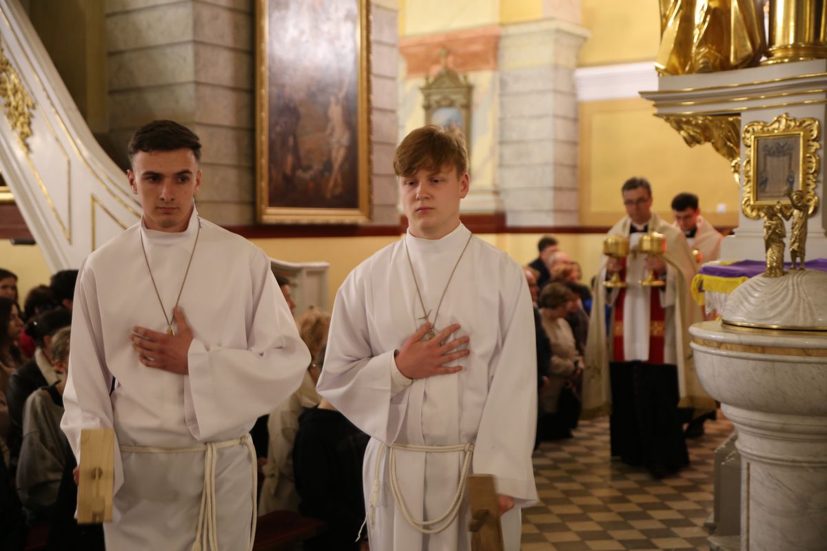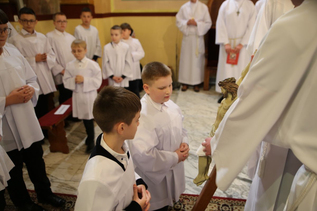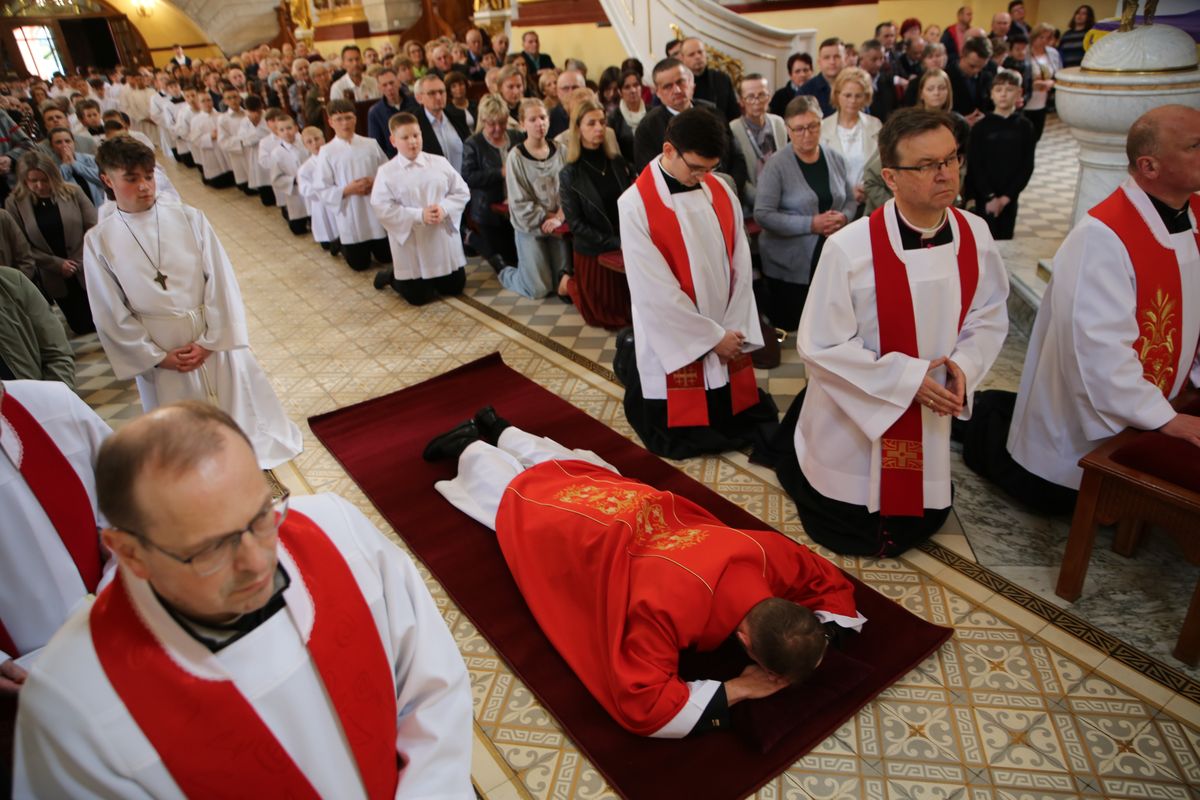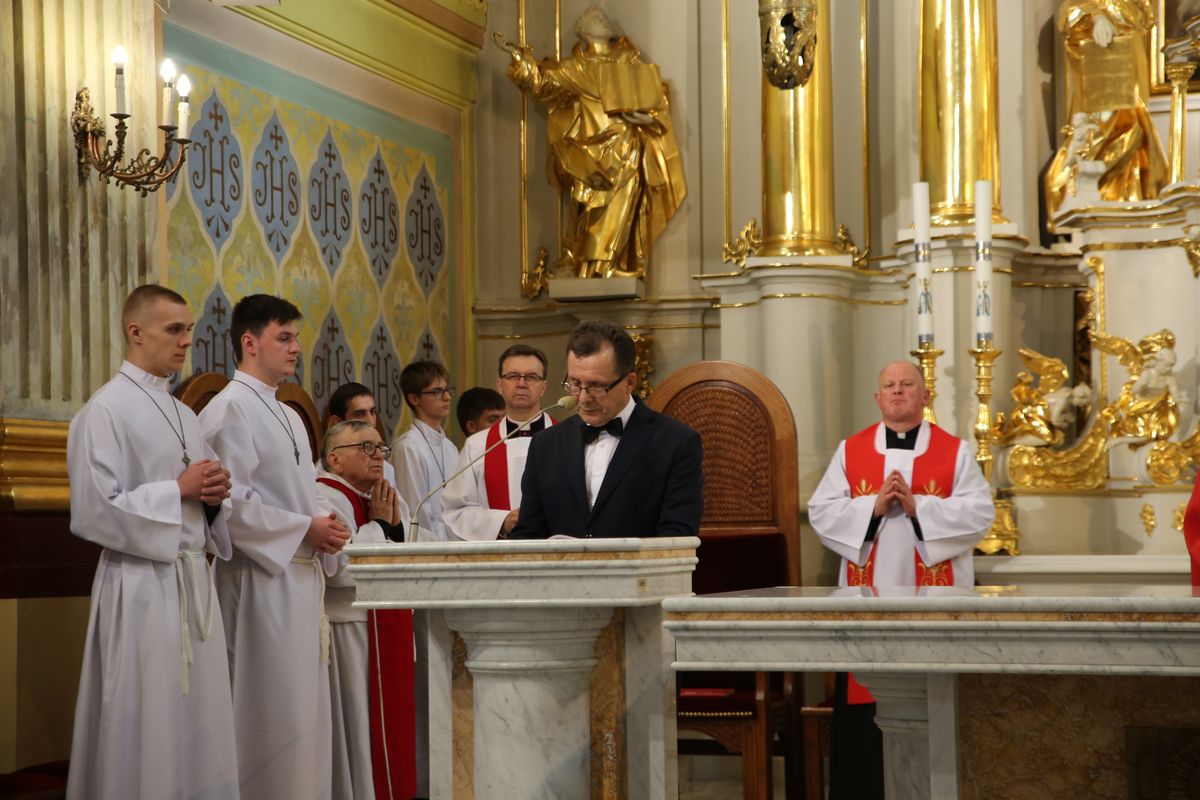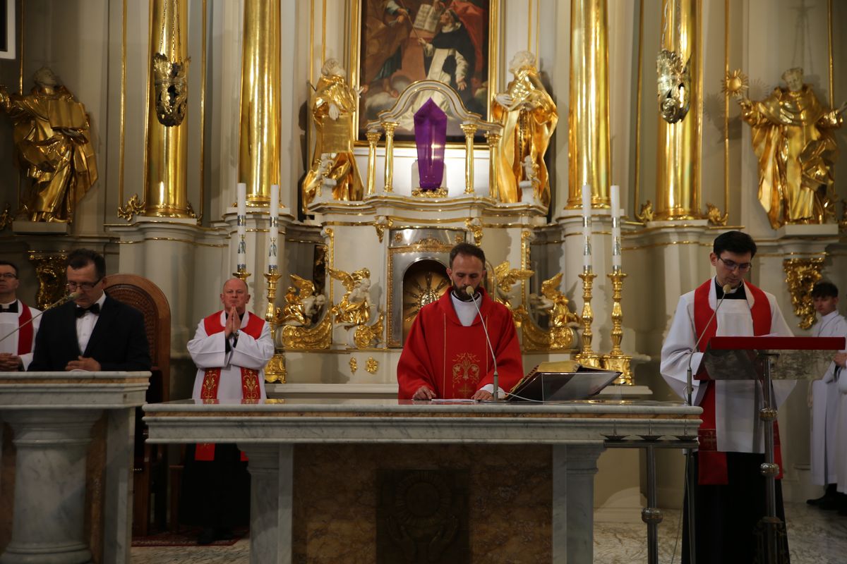 Po zakończeniu nabożeństwa pasyjnego rozpoczęła się Liturgia Wielkiego Piątku, którą rozpoczęło procesjonalne wejście asysty liturgicznej wraz z kapłanami w ciszy do świątyni. Na początku nabożeństwa ks. Tomasz Kopeć, który przewodniczył liturgii, leżał krzyżem na posadzce kościoła na znak uniżenia jakie Jezus podjął podczas swojej męki i śmierci na krzyżu. Uwieńczeniem liturgii Słowa Bożego było odśpiewanie Męki Pańskiej.