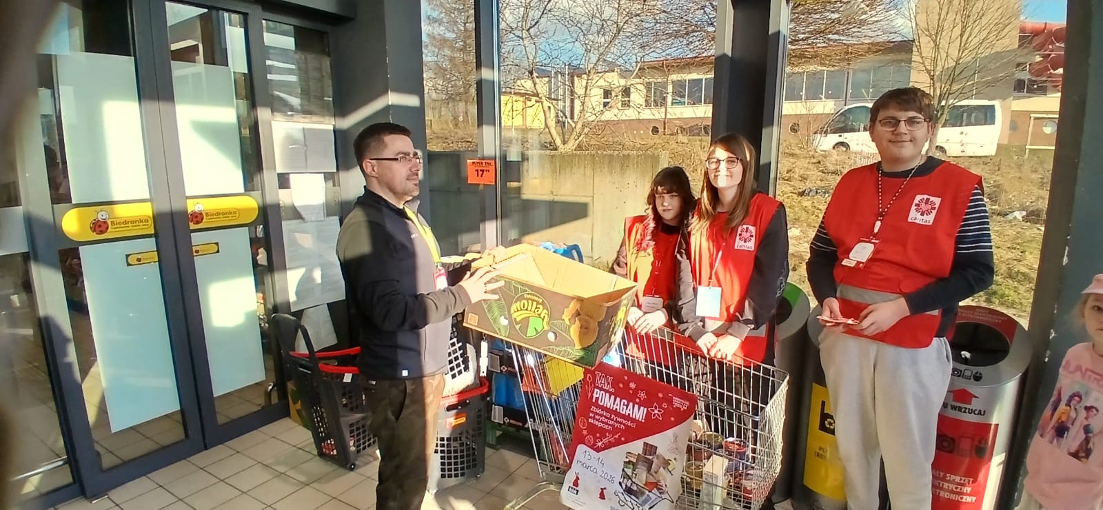 – Jesteśmy tutaj, aby pomóc innym dobrze przeżyć święta. Jedni ofiarują żywność, my ją zbieramy, segregujemy, przygotowujemy paczki a inni dostarczą do osób, które potrzebują wsparcia. Niby nic wielkiego, a jednak wspólne wielkie dzieło – podkreślali młodzi wolontariusze kwestujący w janowskich sklepach Biedronka i Stokrotka. Przez dwa dni trwała kwesta w janowskich marketach, podczas której wolontariusze z I Liceum Ogólnokształcącego im. Bohaterów Porytowego Wzgórza, Zespołu Szkół im. W. Witosa, z Zespołu Szkolno-Przedszkolnego w Janowie Lubelskim oraz z Duszpasterstwa Kobiet, Wojowników Maryi i Stowarzyszenia Motocyklowego Wrzesień39 prowadzili zbiórkę żywności o przedłużonej przydatności do spożycia, segregowali dary i przygotowywali świąteczne paczki. – Osoby robiące zakupy dostawały ulotkę co mogą przekazać potrzebującym i ubogim. Bardzo wiele osób bardzo życzliwie odpowiadało na naszą zachętę do włączenia się do akcji – podkreślali wolontariusze. Akcję koordynowały siostry Maksymiliana Lik i Pia Waldon ze Zgromadzenia Sióstr Opatrzności Bożej posługujące w janowskiej parafii. W zbiórkę zaangażowali się także kapłani posługujący w janowskim sanktuarium. Młodzi wolontariusze kwestowali w sklepach, kolejne ekipy obsługiwały transport przekazanej żywności i prowadziły jej segregację oraz przygotowywały świąteczne paczki.