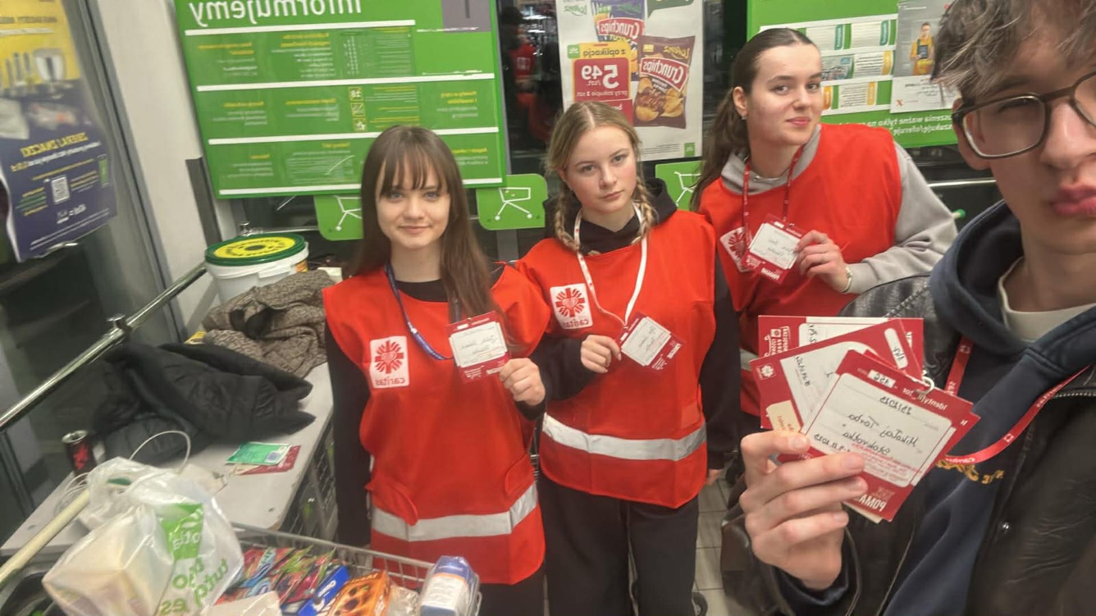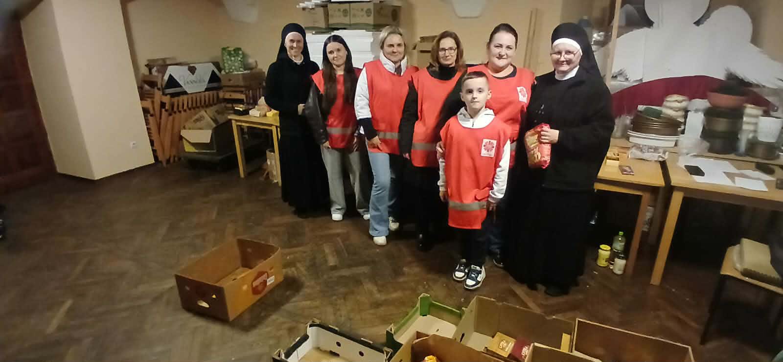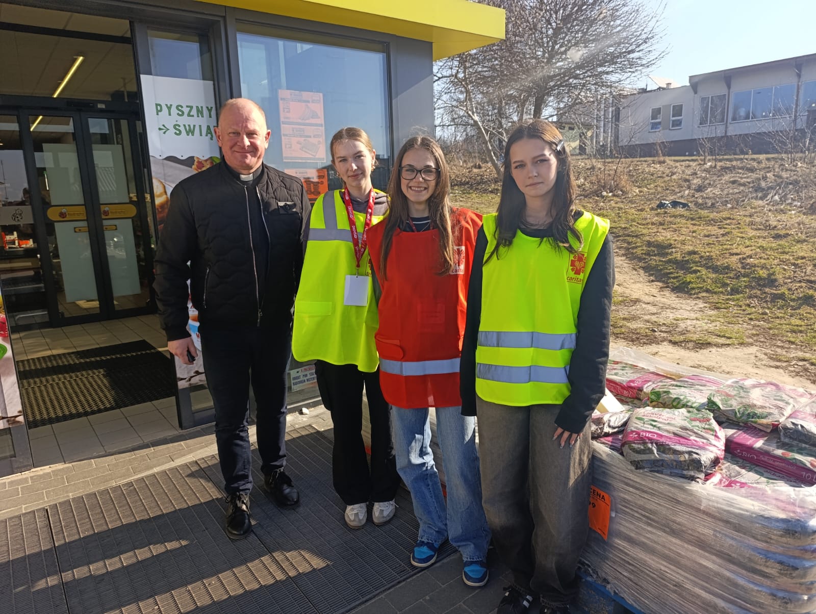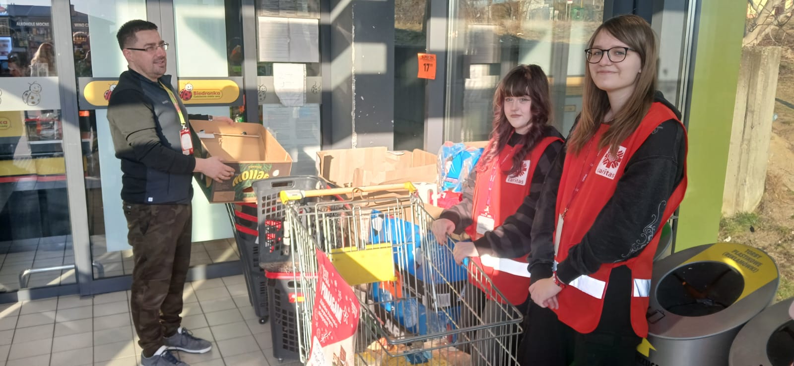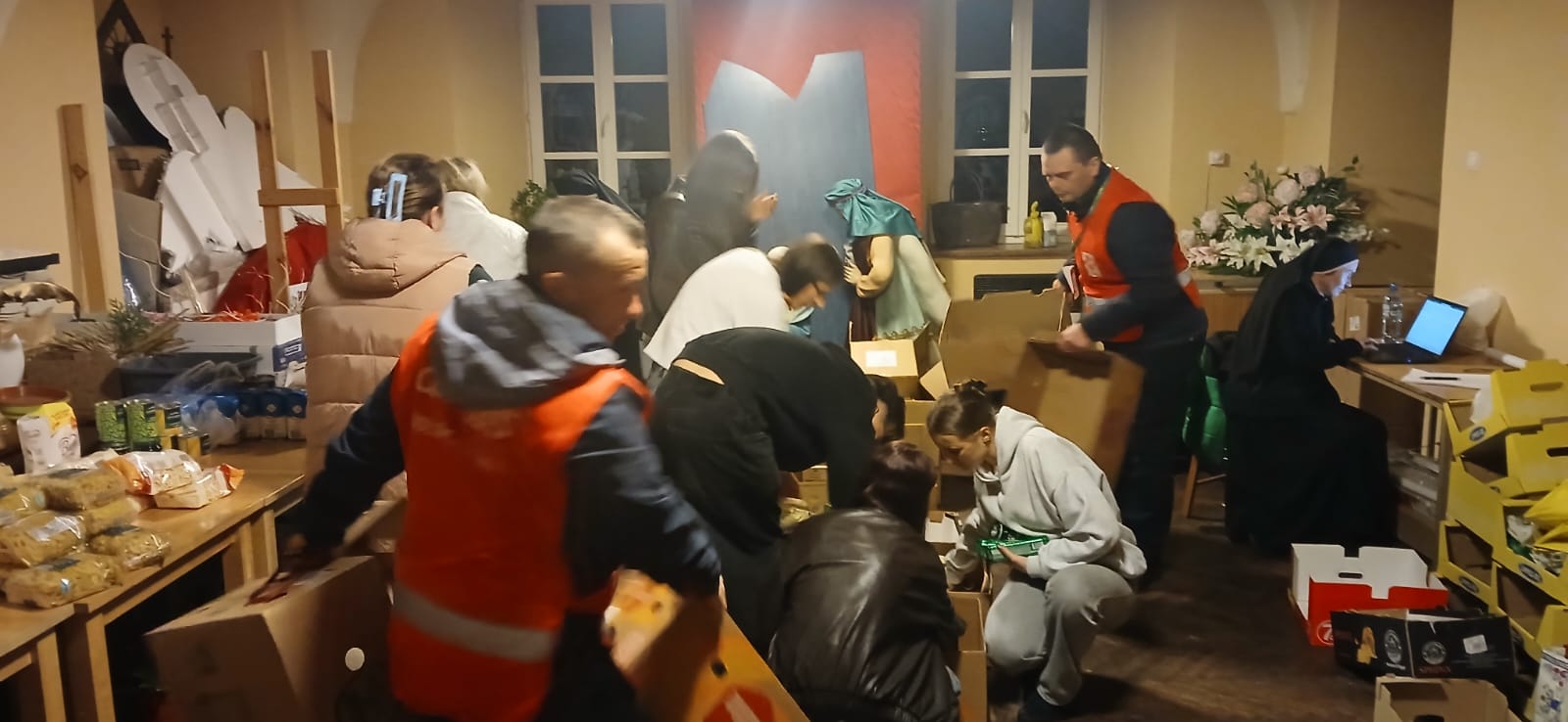 – Jesteśmy tutaj, aby pomóc innym dobrze przeżyć święta. Jedni ofiarują żywność, my ją zbieramy, segregujemy, przygotowujemy paczki a inni dostarczą do osób, które potrzebują wsparcia. Niby nic wielkiego, a jednak wspólne wielkie dzieło – podkreślali młodzi wolontariusze kwestujący w janowskich sklepach Biedronka i Stokrotka. Przez dwa dni trwała kwesta w janowskich marketach, podczas której wolontariusze z I Liceum Ogólnokształcącego im. Bohaterów Porytowego Wzgórza, Zespołu Szkół im. W. Witosa, z Zespołu Szkolno-Przedszkolnego w Janowie Lubelskim oraz z Duszpasterstwa Kobiet, Wojowników Maryi i Stowarzyszenia Motocyklowego Wrzesień39 prowadzili zbiórkę żywności o przedłużonej przydatności do spożycia, segregowali dary i przygotowywali świąteczne paczki. – Osoby robiące zakupy dostawały ulotkę co mogą przekazać potrzebującym i ubogim. Bardzo wiele osób bardzo życzliwie odpowiadało na naszą zachętę do włączenia się do akcji – podkreślali wolontariusze. Akcję koordynowały siostry Maksymiliana Lik i Pia Waldon ze Zgromadzenia Sióstr Opatrzności Bożej posługujące w janowskiej parafii. W zbiórkę zaangażowali się także kapłani posługujący w janowskim sanktuarium. Młodzi wolontariusze kwestowali w sklepach, kolejne ekipy obsługiwały transport przekazanej żywności i prowadziły jej segregację oraz przygotowywały świąteczne paczki.